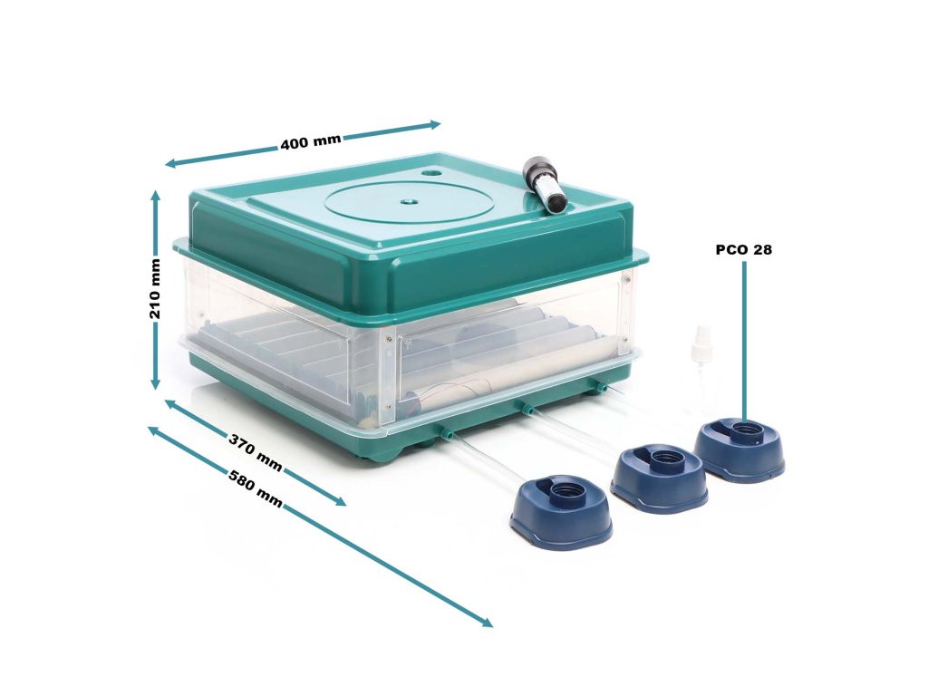 Systém doplňovania vody je vskutku unikátny. Môžete použiť až 3 ľubovoľné PET fľaše (nie sú súčasťou balenia), vďaka ktorým sa Vám nestane, že napríklad počas dňa v práci v liahni dôjde voda. Voda bude automaticky pritekať do liahne.