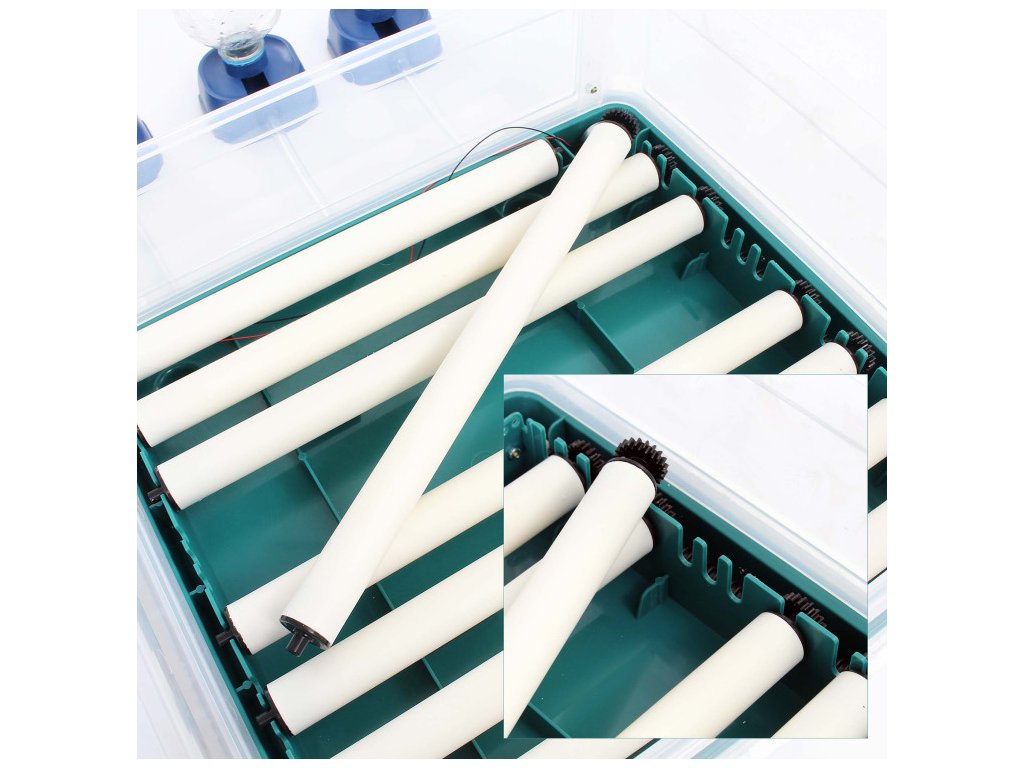 Liaheň je osadená unikátnym systémom otáčania vajec. Otáčací mechanizmus obsahuje 8 valčekov, ktoré môžete rozmiestniť podľa veľkosti vajec. Vďaka možnosti zvolenia rozostupov medzi vajcami môžete liahnuť od prepeličích až po pštrosie vajcia. Kapacita sa líši podľa veľkosti vajec.
