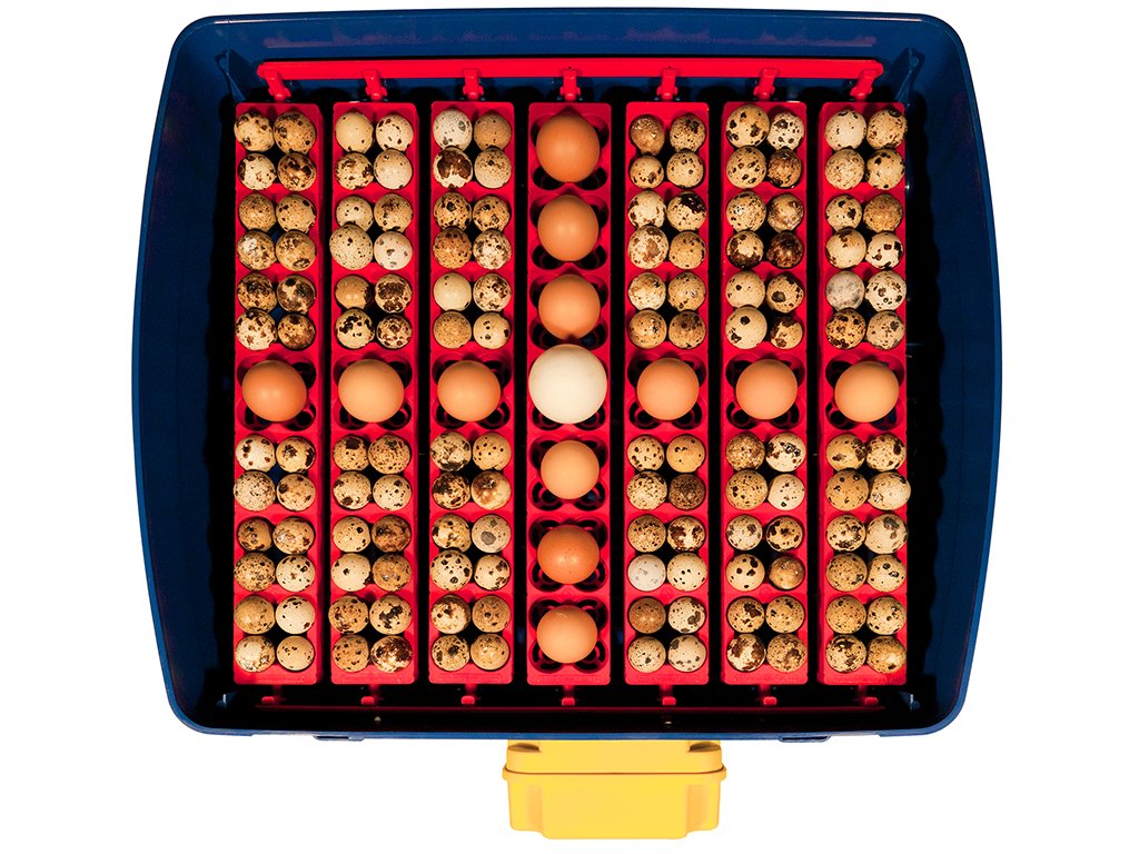 Kapacita s otočným roštom: 49 slepačích, 196 prepeličích, 49 husacích, 49 kačacích alebo 49 bažantích vajec.