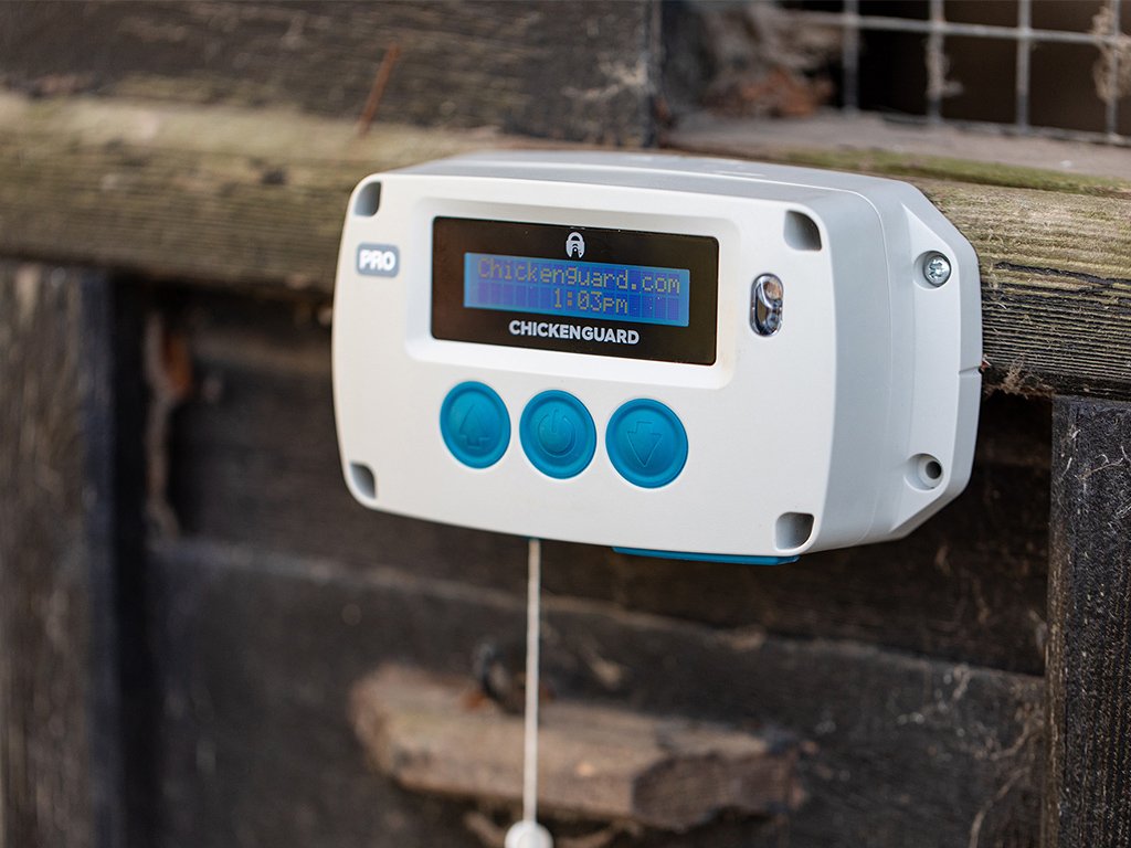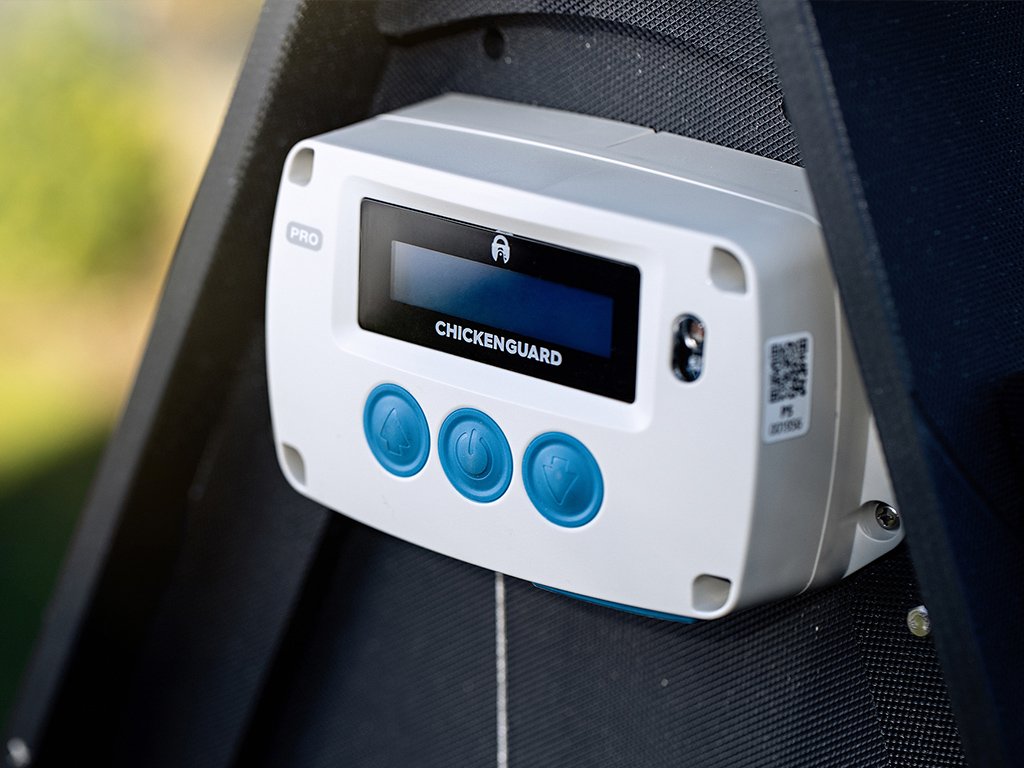 Chicken Guard Pro má veľmi výkonný motor, ktorý dokáže zdvihnúť až 2 kg, takže je ideálny na otváranie väčších a ťažších dvierok. Súčasťou zariadenia je aj bezkontaktný snímač polohy dvierok. Prístroj je vybavený veľmi odolným puzdrom, a tak zaisťuje perfektnú ochranu pri extrémnych poveternostných podmienkach až do teploty -20 °C. Všetky potrebné informácie o nastavení sú prehľadne znázornené na dvojriadkovom LCD displeji. LCD displej prejde po určitej dobe nečinnosti do "režimu spánku", aby sa zvýšila životnosť displeja. Zariadenie znovu "prebudíte" stlačením tlačidla MENU. Pre nastavovanie programov slúžia extra veľké tlačidlá, aby bolo možné ich ovládať aj v rukaviciach.