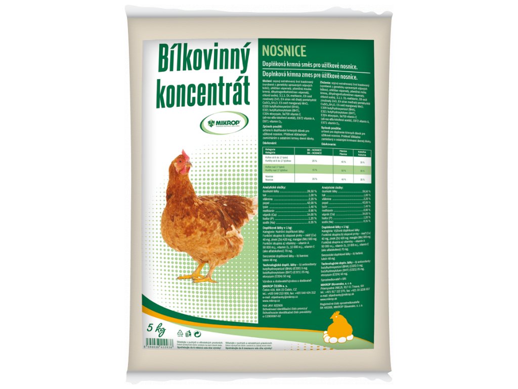 Kvalitný bielkovinový koncentrát pre nosnice, ktorý slúži na dopĺňanie kŕmnych dávok. Obsahuje vysoký obsah dusíkatých látok a esenciálnych aminokyselín z vysoko kvalitného sójového extrahovaného šrotu. Minerálne krmivo zaistí dostatočný obsah Ca, P, Na a ďalších dôležitých prvkov pre kvalitnú výživu nosníc v čase znášky.