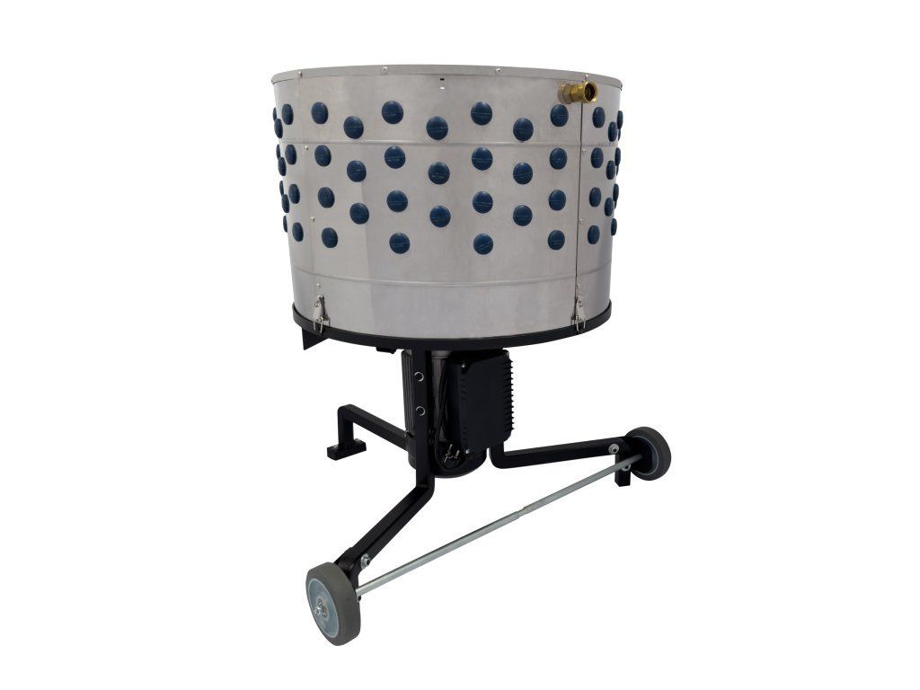 Novinka na nášmu trhu! Nerezová bubnová šklbačka PROFI-C. Škubačku poháňa motor s výkonom 1100 W. Je osadená 164 ks šklbacích prstov typu 0300, ktoré sú navrhnuté pre šklbanie vodnej i hrabavej hydiny. Bubon šklbačky pojme až 3 ks hydiny do celkovej váhy 13 kg. Po obvode bubna sa nachádza oplachovacia hadica, vďaka ktorej sa počas šklbania perie odplavuje von z bubna. Šklbačka je rozoberateľná, takže ponúka veľmi ľahké čistenie. Pre pohodlné premiestňovanie je vybavená dvoma gumovými kolesami. Rozmery: 739x462x976 mm.