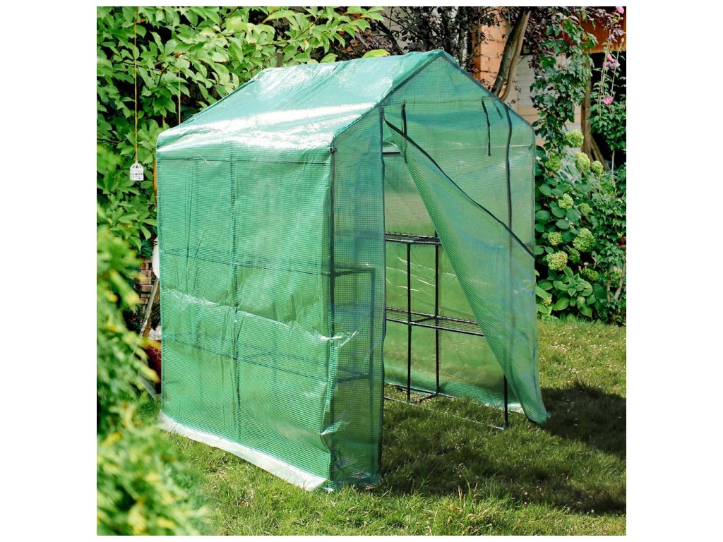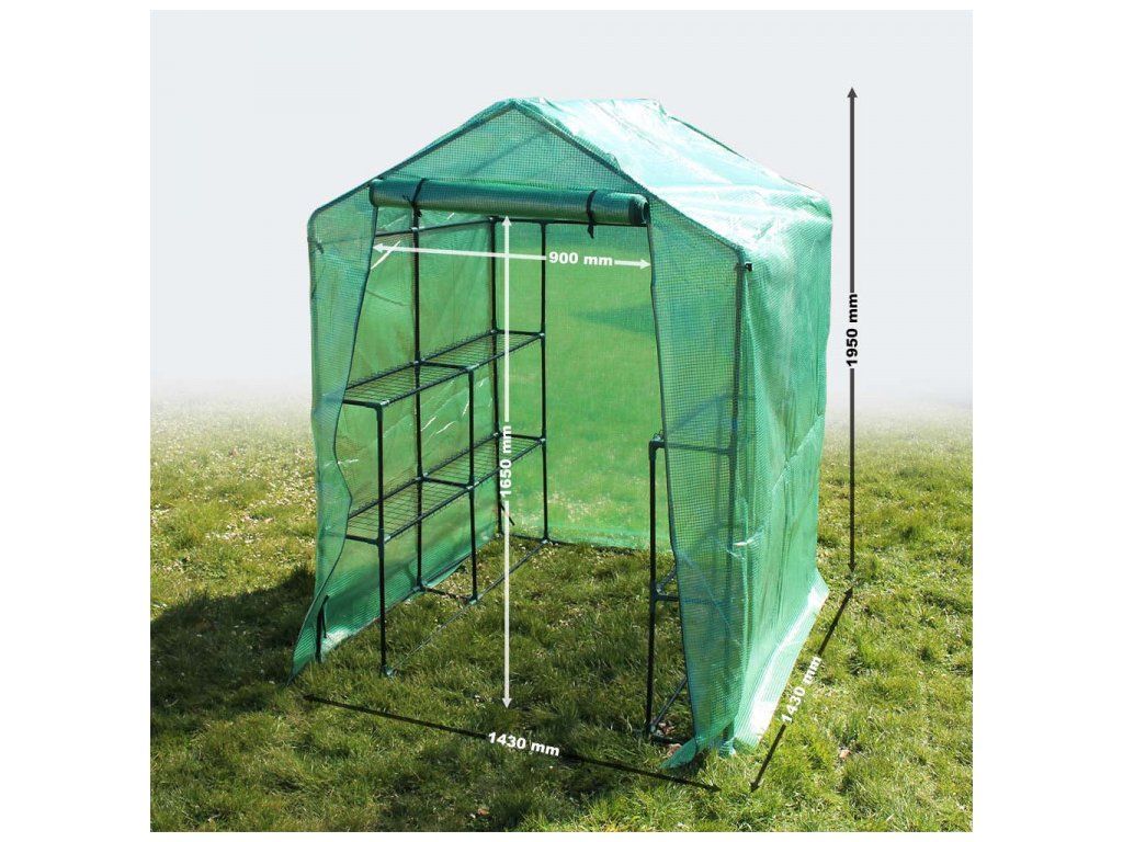 Tento skleník ponúká dostatok priestoru pre viac rastlín vďaka veľkorysým rozmerom 143 x 143 x 195 cm. Predná časť sa môže otvárať a zatvárať pomocou zipsu. Vnútri skleníka sa nachádza 8 kovových políc, ktoré poskytujú dostatok priestoru pre správne umiestnenie kvetináčov aj záhradného náradia.