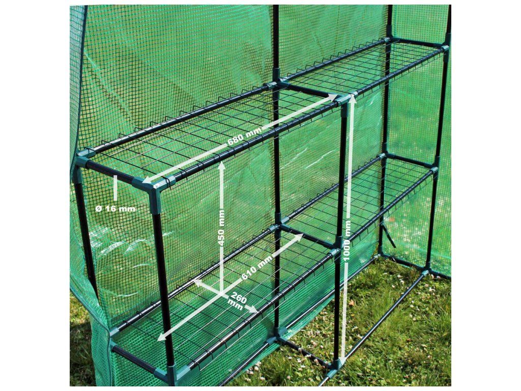 Bol navrhnutý pre pohodlné pestovanie a zaujme obzvlášť robustným rámom z odolného kovu. Fólia odolná proti UV žiareniu s hmotnosťou 140 g / m² vyrobená z polyetylénu ponúká spoľahlivú ochranu pred dažďom, vetrom, krupobitím a chladom všeobecne. Súčasne vytvára ideálne prostredie pre pestovanie zaistením rovnomerného vystavenie slnečnému žiareniu.