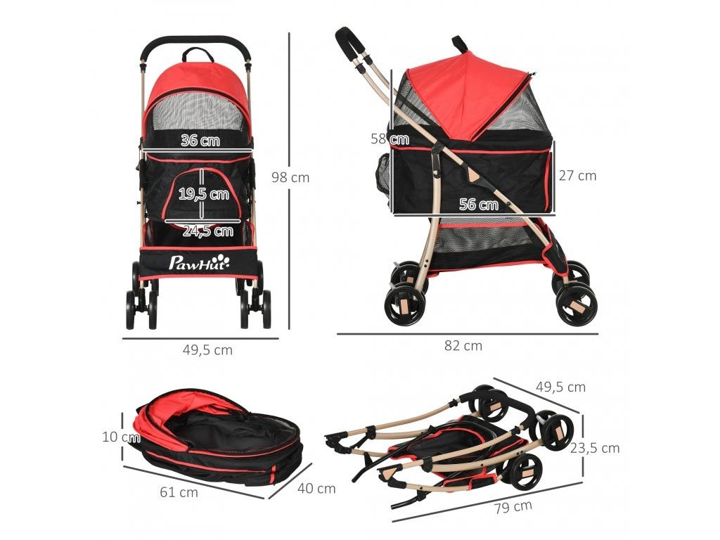 Kočík 2v1 pre psov do 10kg, tiež ako prenosná taška, oceľový rám, poťah z tkaniny Oxford, predné a zadné sieťované okienka, skladacia 4 stupňová strieška, sieťované dvierka na zips, polstrovaná ležacia plocha, vo vnútri koša 2 bezpečnostné vodítka, 2 otáčacie predné kolesá s pružinami, 2 pevné zadné kolesá s brzdami, rozmery koša s baldachýnom 56x36x58cm, celkové rozmery kočíka 82x49,5x98cm.