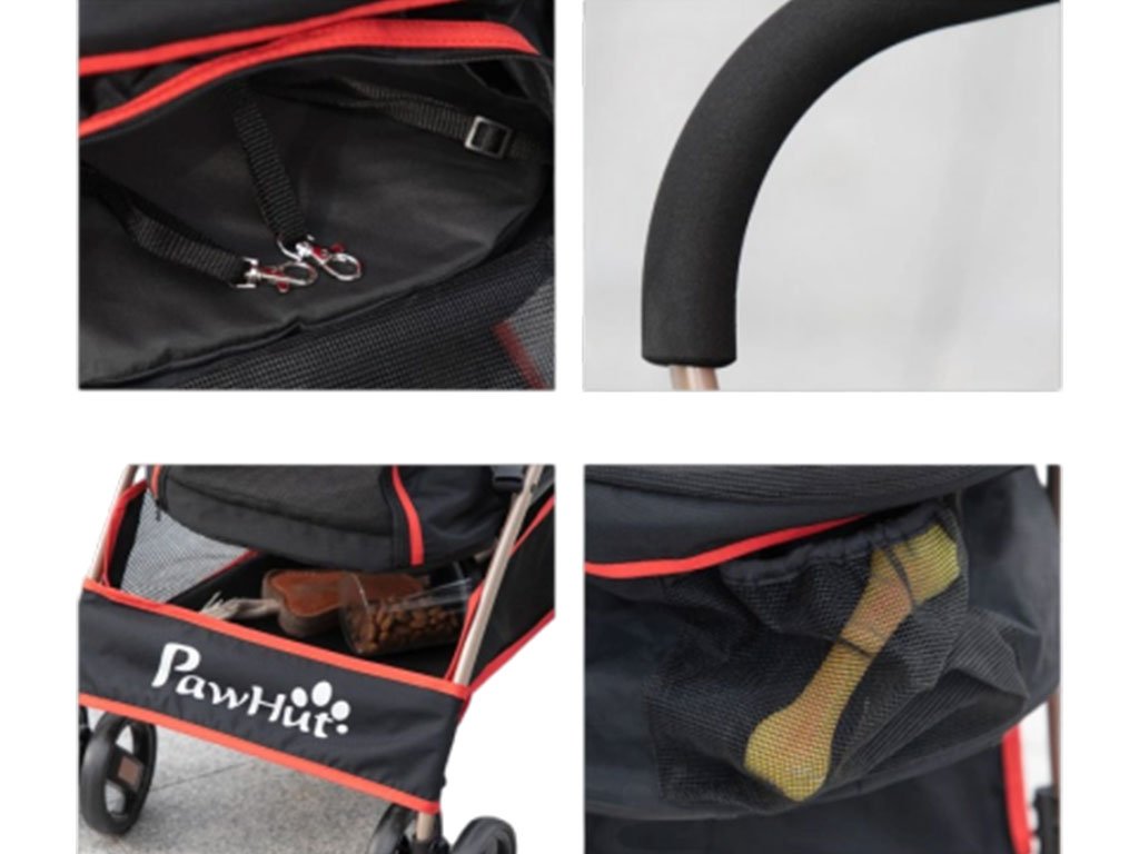 So 4-stupňovou sklápacou strechou je možné psa v kočíku ľahko uzavrieť a vďaka sieťovanej prednej a zadnej strane striešky má pes nielen dobrý výhľad, ale aj prísun čerstvého vzduchu. Striešku jednoducho zaistíte zapínaním, aby pes nemohol vyskočiť a navyše psa môžete pripnúť na dve bezpečnostné vodítka vo vnútri kočíka. Polstrované dno kočíka ponúka psovi pohodlné ležanie počas jazdy. Počas ležania môže pes pozorovať okolie cez sieťované predné dvierka na zips, ktoré je možné otvoriť. Kočík má taktiež dostatok úložného priestoru na výbavu pre psa. Spodné veľké vrecko pod korbou kočíka slúži na uloženie väčších potrieb ako je fľaša s vodou, vodítko, deka a ďalšie potreby pre psov.