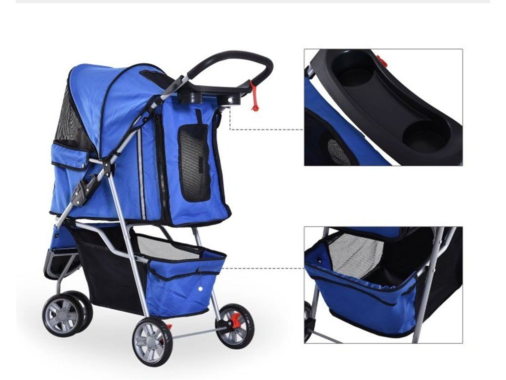 Kočík pre psy do 10kg, 2 držiaky na fľaše, oceľový rám, poťah z tkaniny Oxford, sklápacia strecha proti slnku, predné sieťované dvierka na zips, zadné dvierka s taškou na zips, vnútri 2 bezpečnostné vodítka, dvojité otáčacie predné kolesá, 2 dvojité pevné zadné kolesá s brzdami, vnútorné rozmery s baldachýnom 55x32x52cm, celkové rozmery kočíka 75x45x97cm.