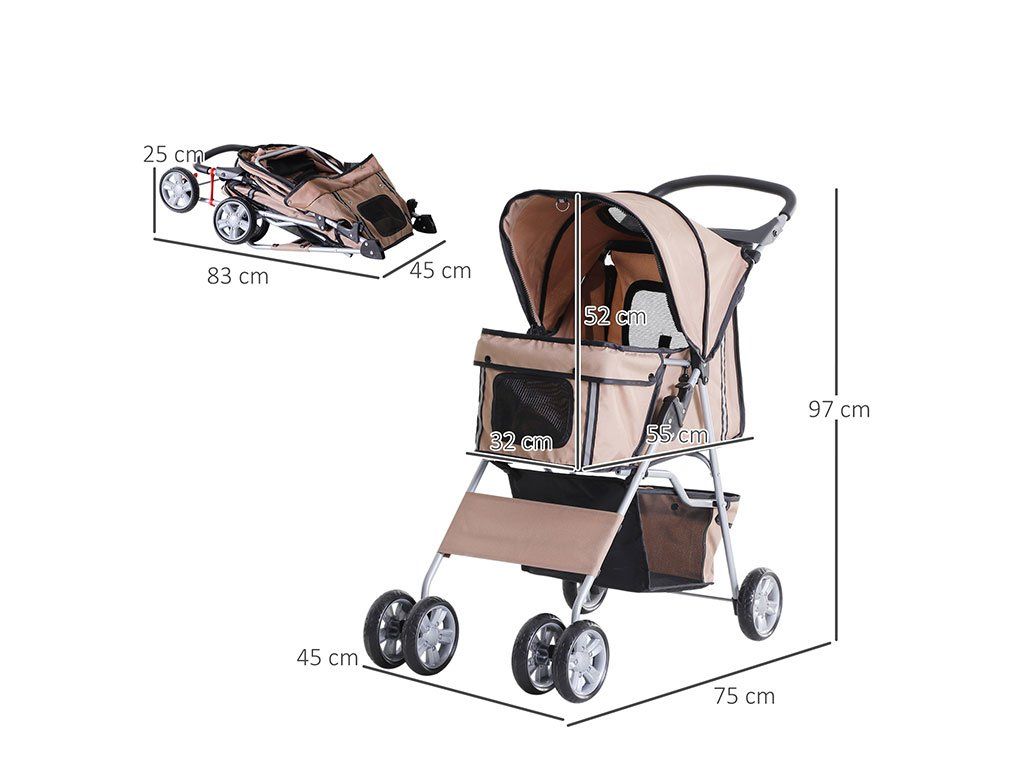 Kočík pre psov do 4kg, 2 držiaky na fľaše, oceľový rám, poťah z tkaniny Oxford, sklápacia strecha proti slnku, predné sieťované dvierka na zips, zadné dvierka s taškou na zips, vnútri 2 bezpečnostné vodítka, dvojité otáčacie predné kolesá, 2 dvojité pevné zadné kolesá s brzdami, vnútorné rozmery s baldachýnom 55x32x52cm, celkové rozmery kočíka 75x45x97cm.