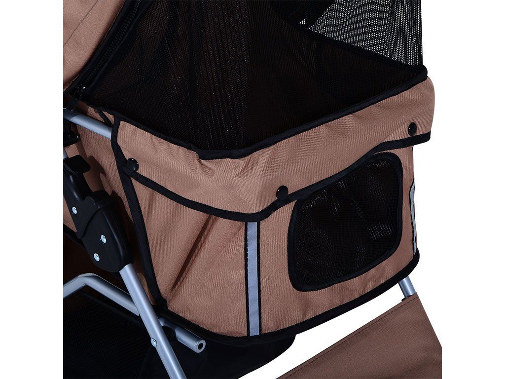 So sklápacou strechou proti slnku je možné psa v kočíku ľahko uzavrieť a vďaka veľkému sieťovanému oknu v strieške a sieťovaným dvierkam má pes nielen dobrý výhľad, ale aj prísun čerstvého vzduchu. Manipulácia so psom bude cez predné a zadné rozopínacie dvierka na zips jednoduchá a psa následne môžete pripnúť na dve bezpečnostné vodítka vo vnútri kočíka. Kočík má taktiež dostatok úložného priestoru na výbavu pre psa. Spodné veľké vrecko pod korbou kočíka slúži na uloženie väčších potrieb ako je fľaša s vodou, vodítko, deka a ďalšie potreby pre psov. Praktické vrecko na zips na zadných dvierkach je umiestnené hneď po ruke pre drobné potreby ako sú maškrty, alebo doklady.