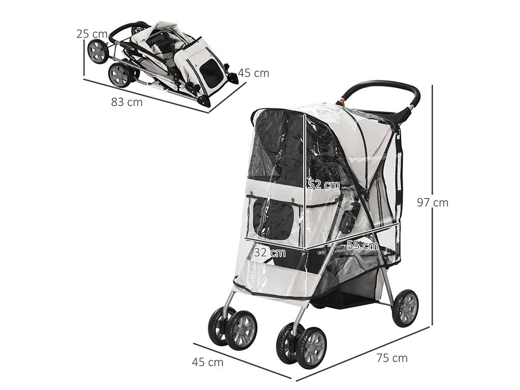 Kočík pre psy do 10kg, s pršiplášťom proti dažďu, 2 držiaky na fľaše, oceľový rám, poťah z tkaniny Oxford, sklápacia strecha proti slnku, predné sieťované dvierka na zips, zadné dvierka s taškou na zips, vnútri 2 bezpečnostné vodítka, dvojité otáčacie predné kolesá, 2 dvojité pevné zadné kolesá s brzdami, vnútorné rozmery s baldachýnom 55x32x52cm, celkové rozmery kočíka 75x45x97cm.