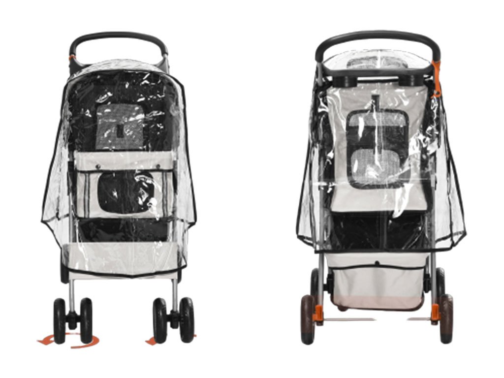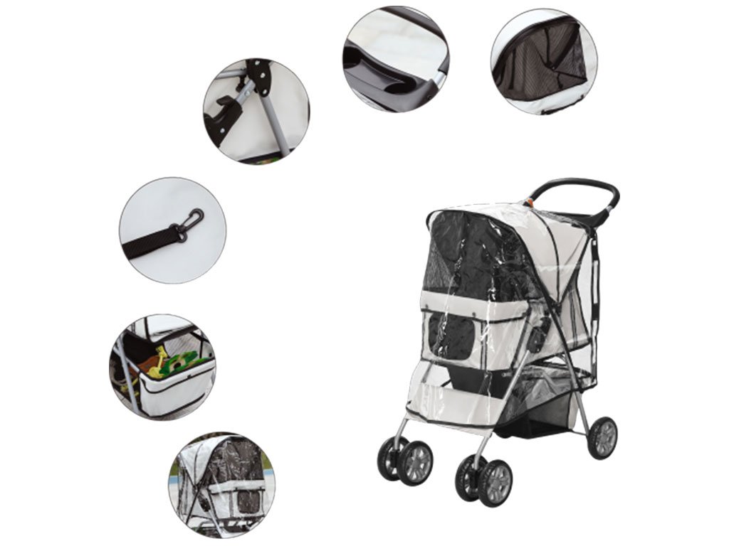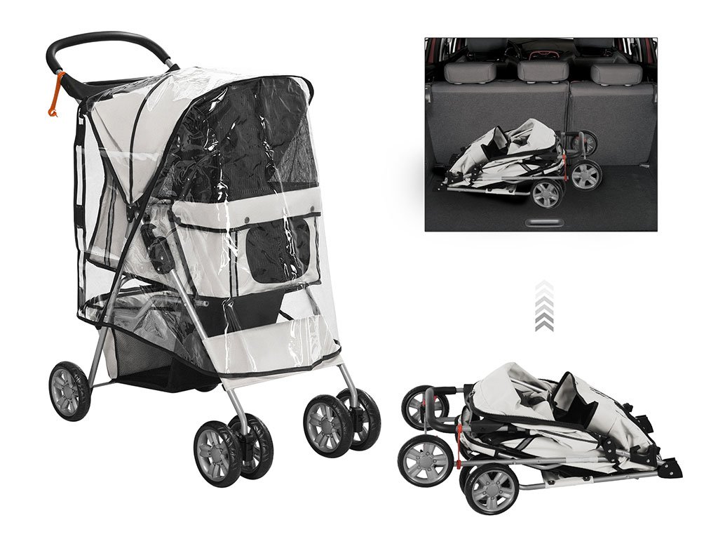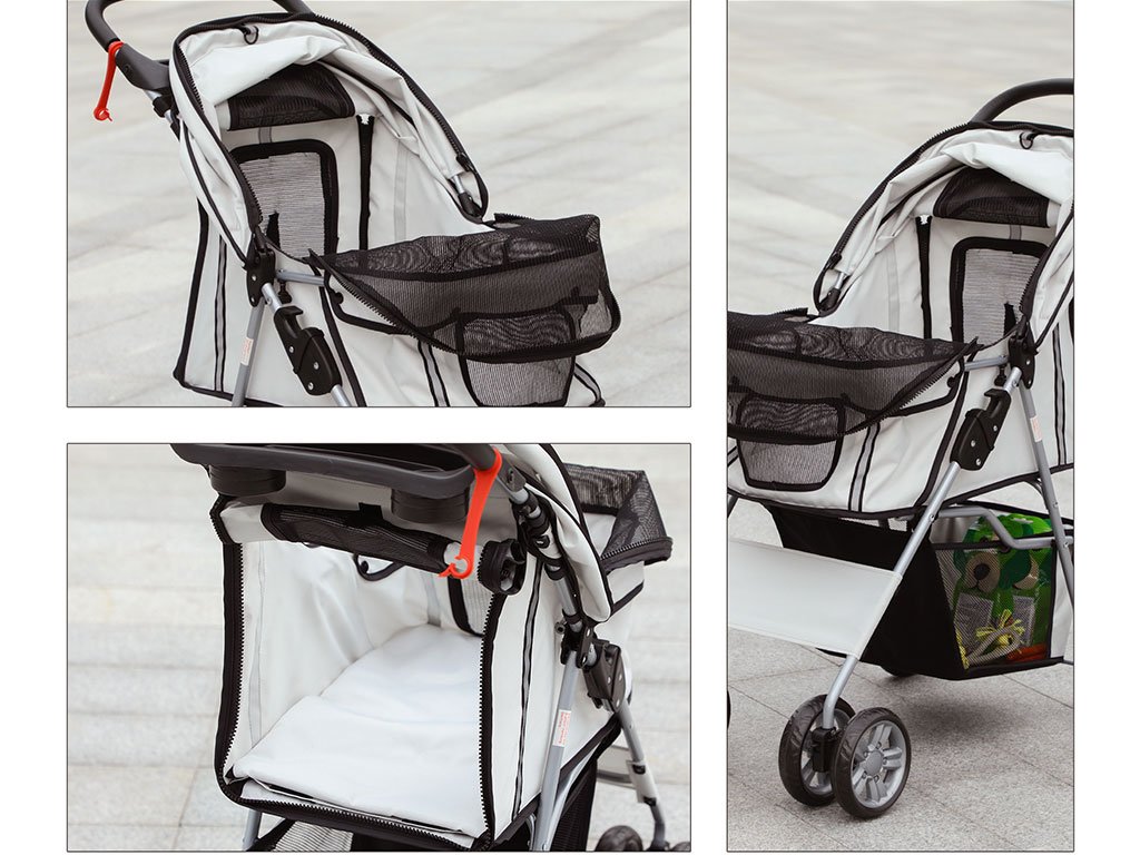 So sklápacou strechou proti slnku je možné psa v kočíku ľahko uzavrieť a vďaka veľkému sieťovanému oknu v strieške a sieťovaným dvierkam má pes nielen dobrý výhľad, ale aj prísun čerstvého vzduchu. Manipulácia so psom bude cez predné a zadné rozopínacie dvierka na zips jednoduchá a psa následne môžete pripnúť na dve bezpečnostné vodítka vo vnútri kočíka. Kočík má taktiež dostatok úložného priestoru na výbavu pre psa. Spodné veľké vrecko pod korbou kočíka slúži na uloženie väčších potrieb ako je fľaša s vodou, vodítko, deka a ďalšie potreby pre psov. Praktické vrecko na zips na zadných dvierkach je umiestnené hneď po ruke pre drobné potreby ako sú maškrty, alebo doklady.