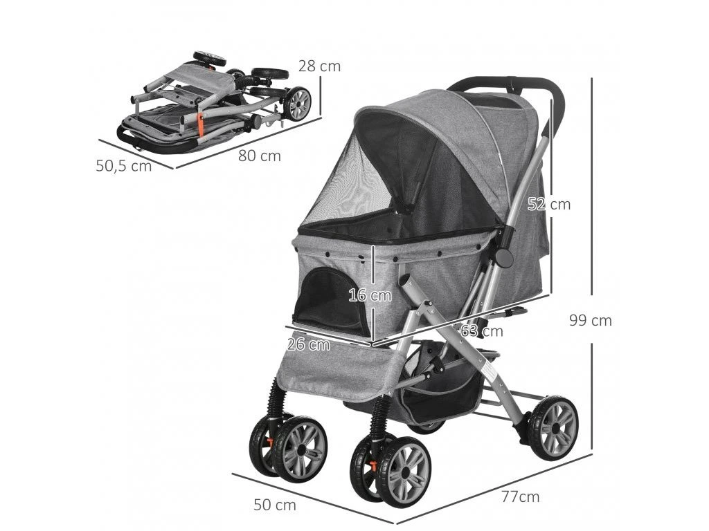 Kočík pre psov do 10kg, oceľový rám, poťah z tkaniny Oxford, skladacia 3 stupňová strieška na zips, predné sieťované dvierka na zips, zadné dvierka s taškou na zips, vo vnútri 2 bezpečnostné vodítka, dvojité otáčacie predné kolesá, 2 dvojité pevné zadné kolesá s brzdami, vnútorné rozmery s baldachýnom 63x36x52 cm, celkové rozmery kočíka 77x50x99 cm.