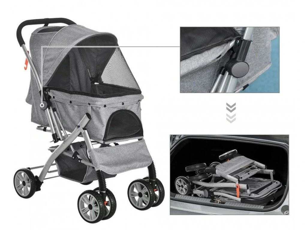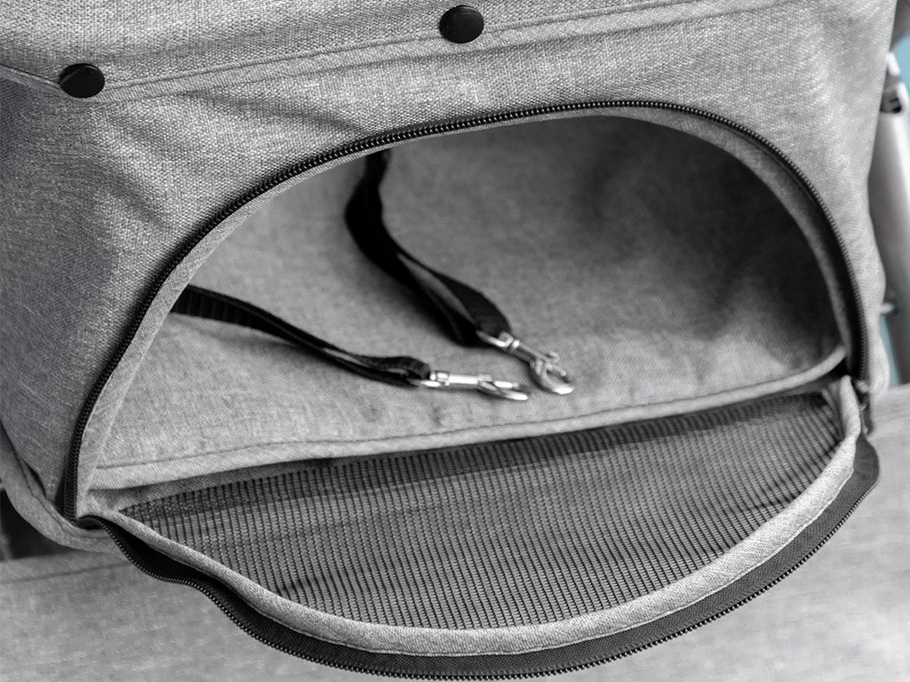 S 3-stupňovou sklápacou strechou na zips je možné psa v kočíku ľahko uzavrieť a vďaka veľkému sieťovanému oknu v strieške a sieťovaným dvierkam má pes nielen dobrý výhľad, ale aj prísun čerstvého vzduchu. Manipulácia so psom bude cez predné a zadné rozopínacie dvierka na zips jednoduchá a psa následne môžete pripnúť na dve bezpečnostné vodítka vo vnútri kočíka. Kočík má taktiež dostatok úložného priestoru na výbavu pre psa. Spodné veľké vrecko pod korbou kočíka slúži na uloženie väčších potrieb ako je fľaša s vodou, vodítko, deka a ďalšie potreby pre psov. Praktické vrecko na zips na zadných dvierkach je umiestnené hneď po ruke pre drobné potreby ako sú maškrty, alebo doklady.
