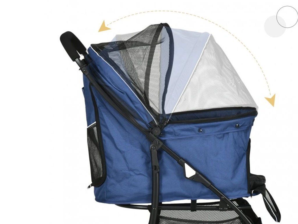So 4-stupňovou sklápacou strechou je možné psa v kočíku ľahko uzavrieť a vďaka sieťovanej prednej a zadnej strane striešky má pes nielen dobrý výhľad, ale aj prísun čerstvého vzduchu. Striešku jednoducho zaistíte zapínaním, aby pes nemohol vyskočiť a navyše psa môžete pripnúť na dve bezpečnostné vodítka vo vnútri kočíka. Mäkký vankúšik kočíka ponúka psovi pohodlné ležanie počas jazdy. Počas ležania môže pes pozorovať okolie cez sieťované predné dvierka na zips, ktoré je možné otvoriť. Kočík má taktiež dostatok úložného priestoru na výbavu pre psa. Spodné veľké vrecko pod korbou kočíka slúži na uloženie väčších potrieb ako je fľaša s vodou, vodítko, deka a ďalšie potreby pre psov.