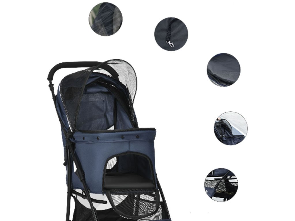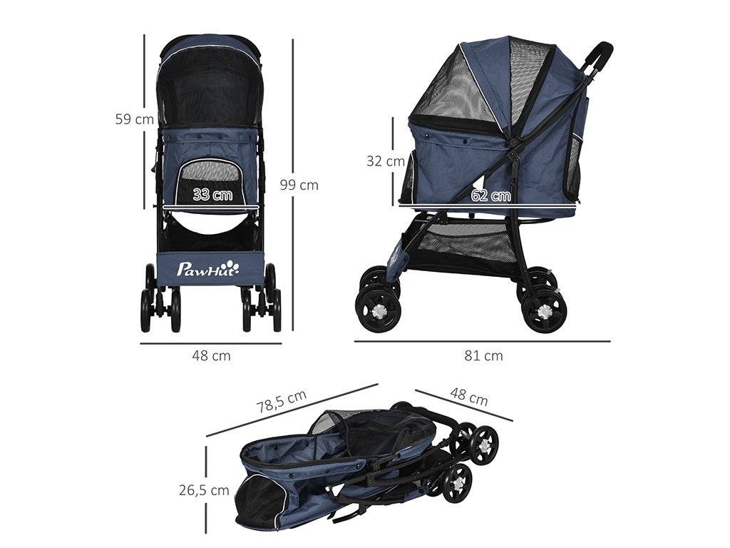 Kočík pre psov do 10kg, oceľový rám, poťah z tkaniny Oxford, predné a zadné sieťované okienka, skladacia 4 stupňová strieška, sieťované dvierka na zips, súčasťou mäkký vankúšik, vnútri koša 2 bezpečnostné vodítka, 2 univerzálne predné kolesá, 2 pevné zadné kolesá s brzdami, rozmery koša s baldachýnom 62x33x59cm, celkové rozmery kočíka 81x48x99cm.