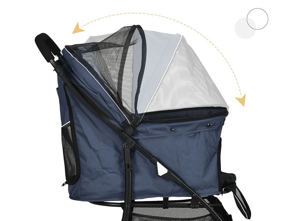 So 4-stupňovou sklápacou strechou je možné psa v kočíku ľahko uzavrieť a vďaka sieťovanej prednej a zadnej strane striešky má pes nielen dobrý výhľad, ale aj prísun čerstvého vzduchu. Striešku jednoducho zaistíte zapínaním, aby pes nemohol vyskočiť a navyše psa môžete pripnúť na dve bezpečnostné vodítka vo vnútri kočíka. Mäkký vankúšik kočíka ponúka psovi pohodlné ležanie počas jazdy. Počas ležania môže pes pozorovať okolie cez sieťované predné dvierka na zips, ktoré je možné otvoriť. Kočík má taktiež dostatok úložného priestoru na výbavu pre psa. Spodné veľké vrecko pod korbou kočíka slúži na uloženie väčších potrieb ako je fľaša s vodou, vodítko, deka a ďalšie potreby pre psov.