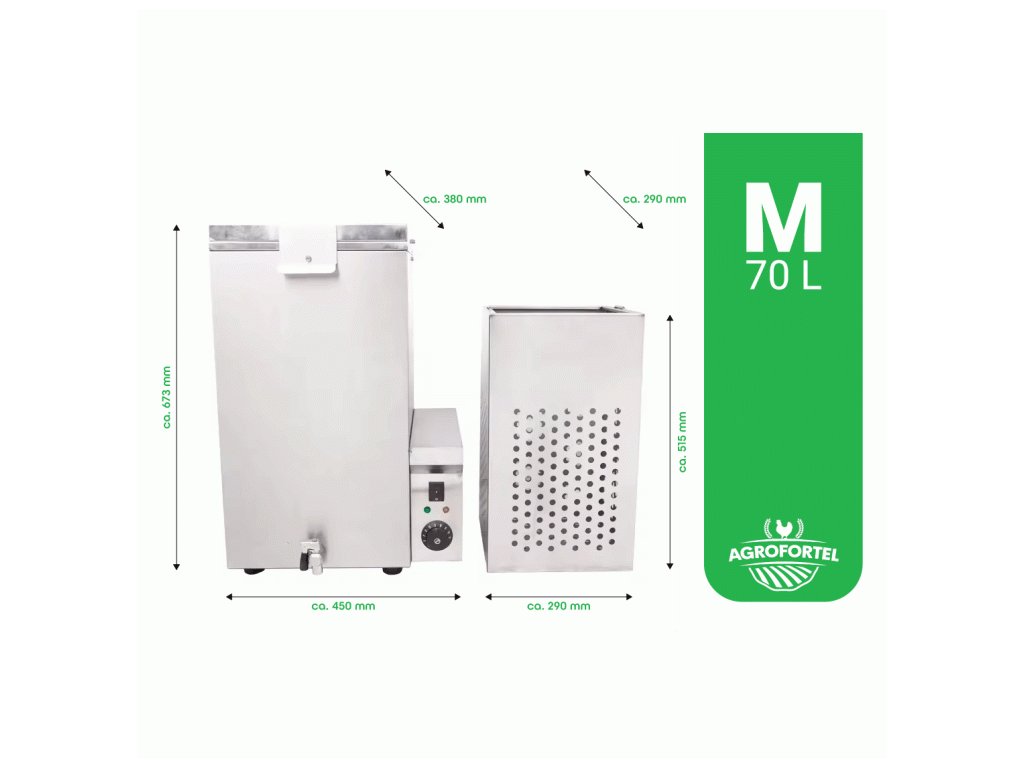 Predstavujeme Vám celonerezový elektrický kotol na parenie hydiny s objemom 70 litrov . Kotol na sparovanie hydiny Vám pomocou presného regulátora teploty pomôže v dokonalom sparení hydiny na šklbanie v škubačkách. Kotol vám dobre poslúži pri sparovaní prepelíc, husí, kačíc, sliepok, kurčiat, perličiek atď. Termostat umožňuje presné nastavenie požadovanej teploty. Zrazu pojme až 30 kg hydiny. Vnútorný kôš je vyberateľný a umožňuje tak ľahké čistenie.