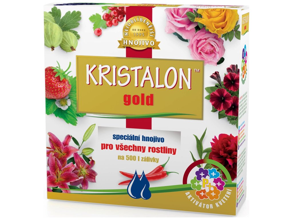 KRISTALON Gold predstavuje hnojivo novej generácie vo forme kryštalického, vodorozpustného produktu s unikátnym zložením a aktivátorom kvitnutia. Toto hnojivo udržuje rastliny v intenzívnom raste, posilňuje ich koreňový systém a celkový stav, a prináša bohatšie kvitnutie a vyššie výnosy plodov. Je univerzálne použiteľné pre ovocie, zeleninu, všetky druhy izbových i vonkajších rastlín, vrátane ovocných stromov a kríkov a vínnej révy, pričom zabraňuje žltnutiu listov. Aktivátor kvitnutia dodáva 75% fosforu vo forme polyfosfátov, čo je pre rastliny prijateľnejšia a účinnejšia forma.