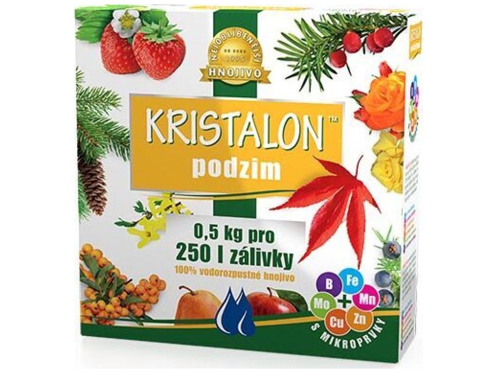 KRISTALON Jeseň je vysoko účinné, kryštalické a vodorozpustné hnojivo, ktoré vďaka vysokému obsahu draslíka podporuje zdravé vyzrievanie pletív a zaisťuje bezproblémové prezimovanie rastlín. Toto hnojivo chráni rastliny pred vymrznutím a je ideálny pre jahody, okrasné dreviny, ruže, ovocné stromy a kríky ako egreše, maliny, černice, vínnu révu, ríbezle a ďalšie.