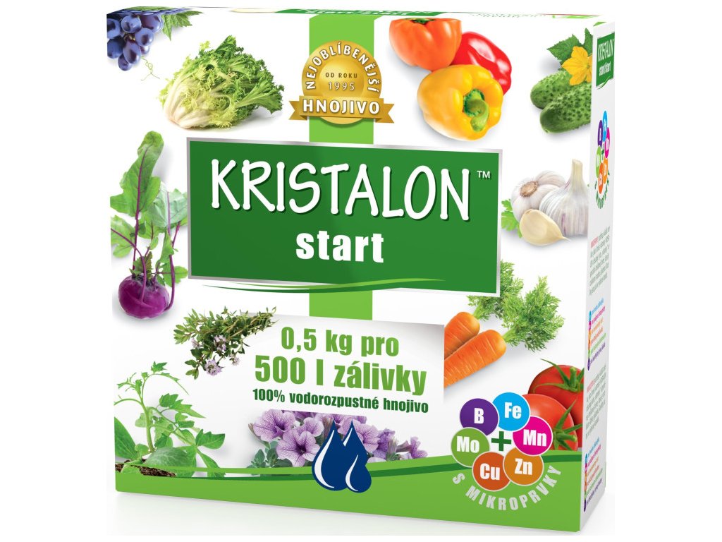 KRISTALON Start je vynikajúce kryštalické hnojivo, ktoré je vodorozpustné a určené pre rýchlejší štart v počiatočnom raste rastlín a ďalej aj v produkčnom období. Toto univerzálne hnojivo je vhodné pre zeleninu, okrasné rastliny vrátane balkónových, cibuľoviny, drobné ovocie aj ovocné stromy, pričom zabraňuje žltnutiu listov. Obsah balenia je 0,5 kg, ktorý vystačí na 500 litrov zálievky.