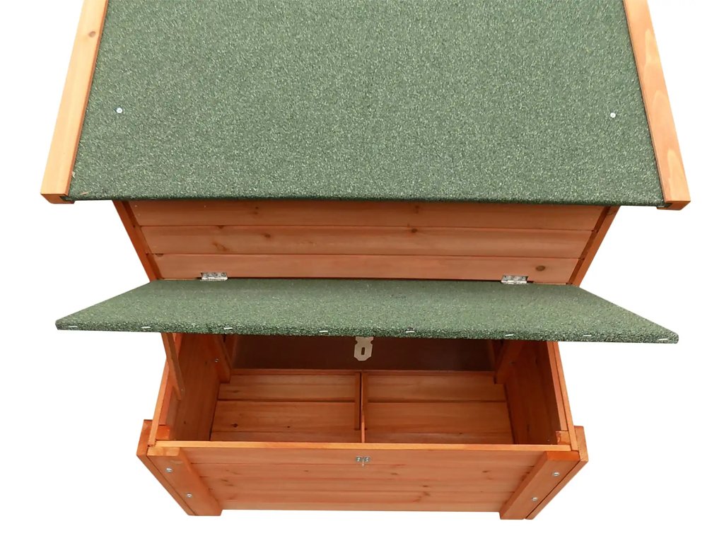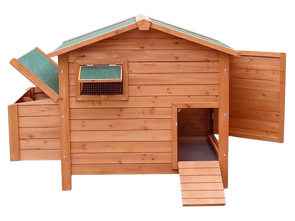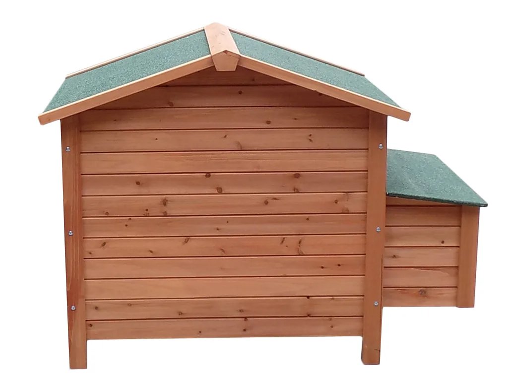 Drevený kurník pre 4-6 ks nosníc, z borovicového dreva, vodotesná strecha, bočné priestranné dvierka, odnímateľné dno pre ľahké čistenie, 2 vodotesné znáškové hniezda, uzatvárateľná vstupná rampa, bidielka, rozmery 1115x900x900 mm.
