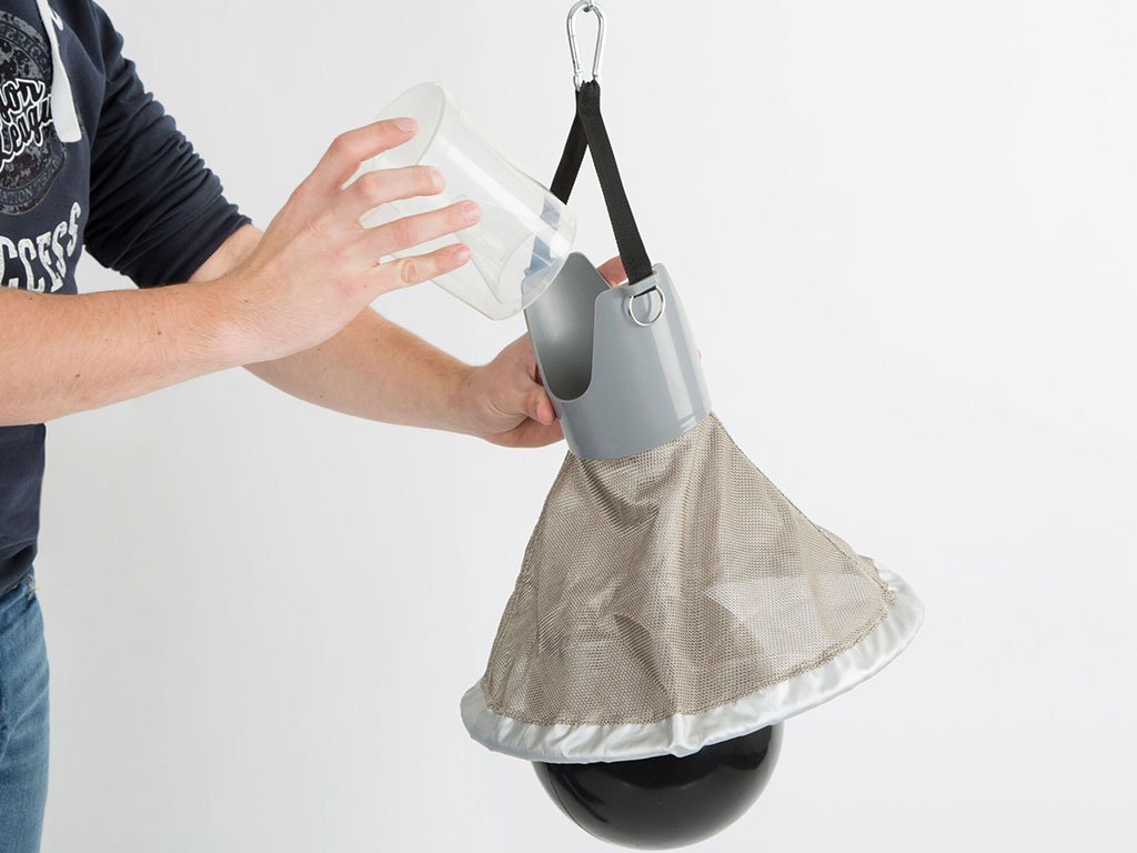 Závesný lapač ovádov, pre plochy do 100 m2, zavesenie vo výške od 100 cm do 180 cm, do ohrád, stajní, záhrad, výbehov, kempov, ihrísk a parkov, šetrné k životnému prostrediu, priemer cca 35 cm, hmotnosť cca 1,545 g.