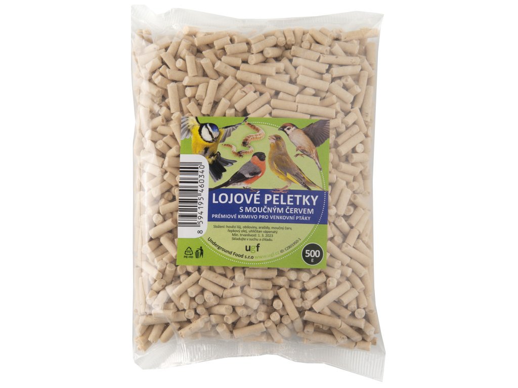 Lojové peletky s múčnym červom sú prémiové krmivo pre vonkajšie vtáky. Obsahujú kvalitné hovädzie loj, obilniny, arašidy a múčne červy. Pre vtáky sú veľmi atraktívne a prilákajú do záhrady rôzne druhy divokých vtákov. Môžu sa podávať samostatne v krmítkoch alebo na zemi. Skvele tiež dopĺňajú rôzne semienkové zmesi. Skladujte v suchu a chlade.