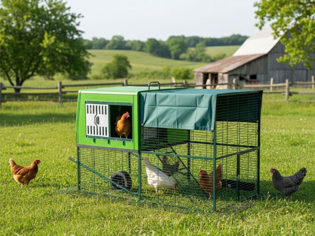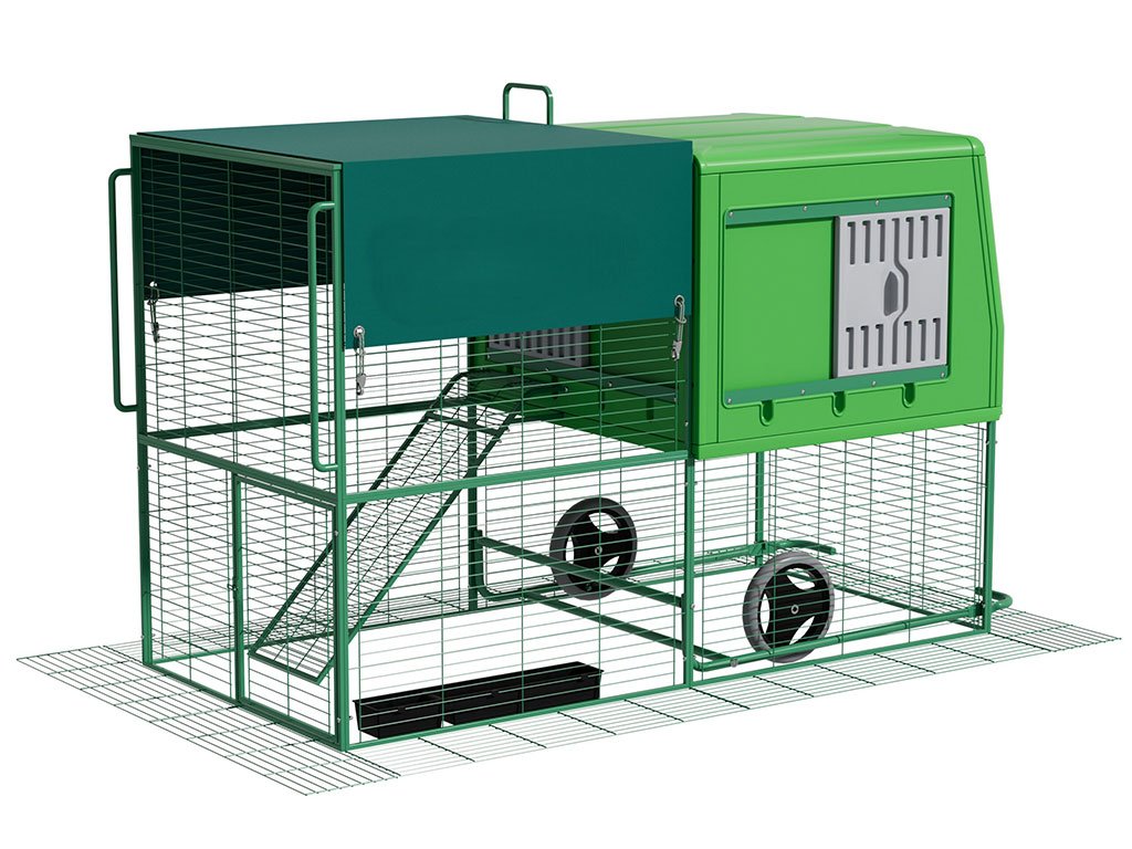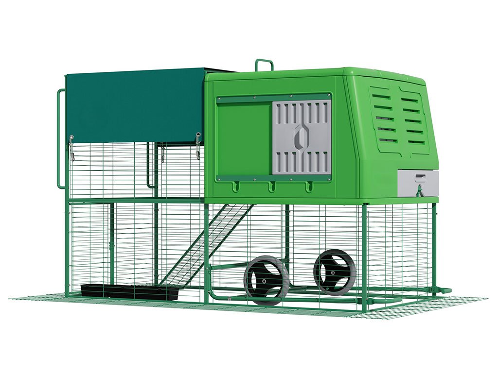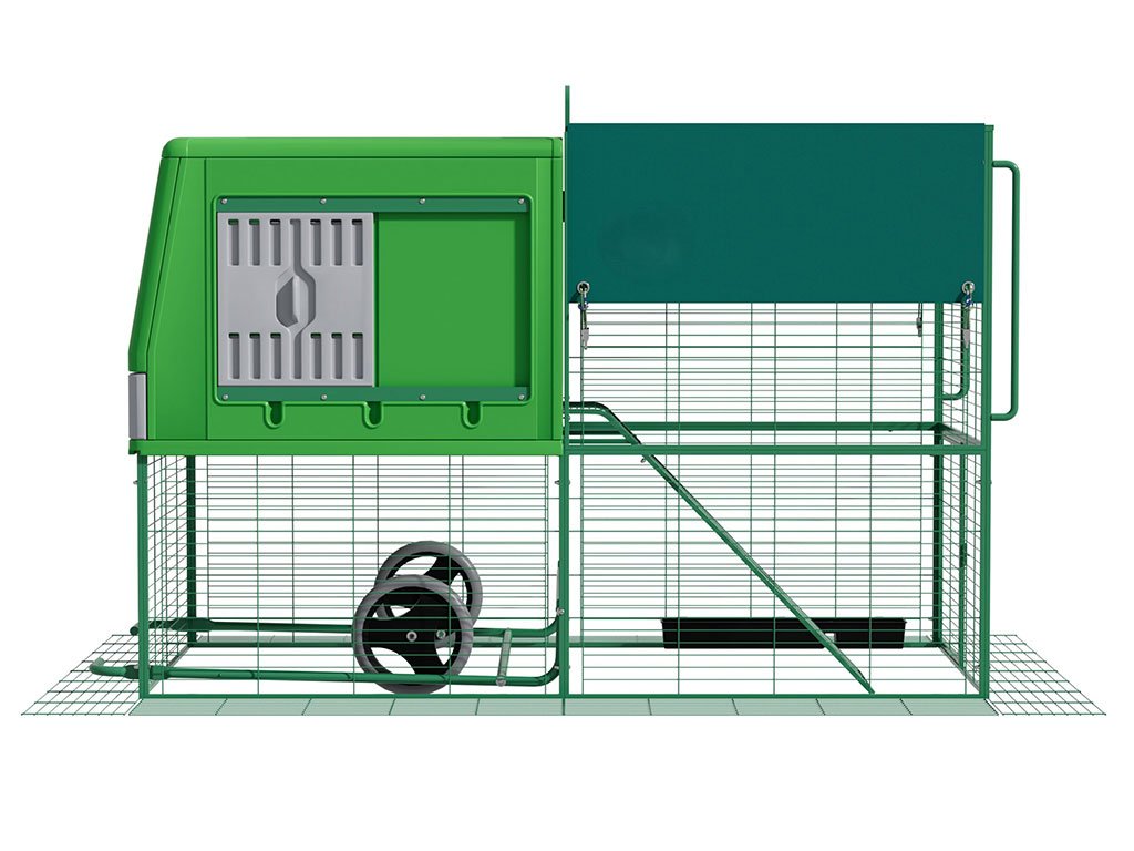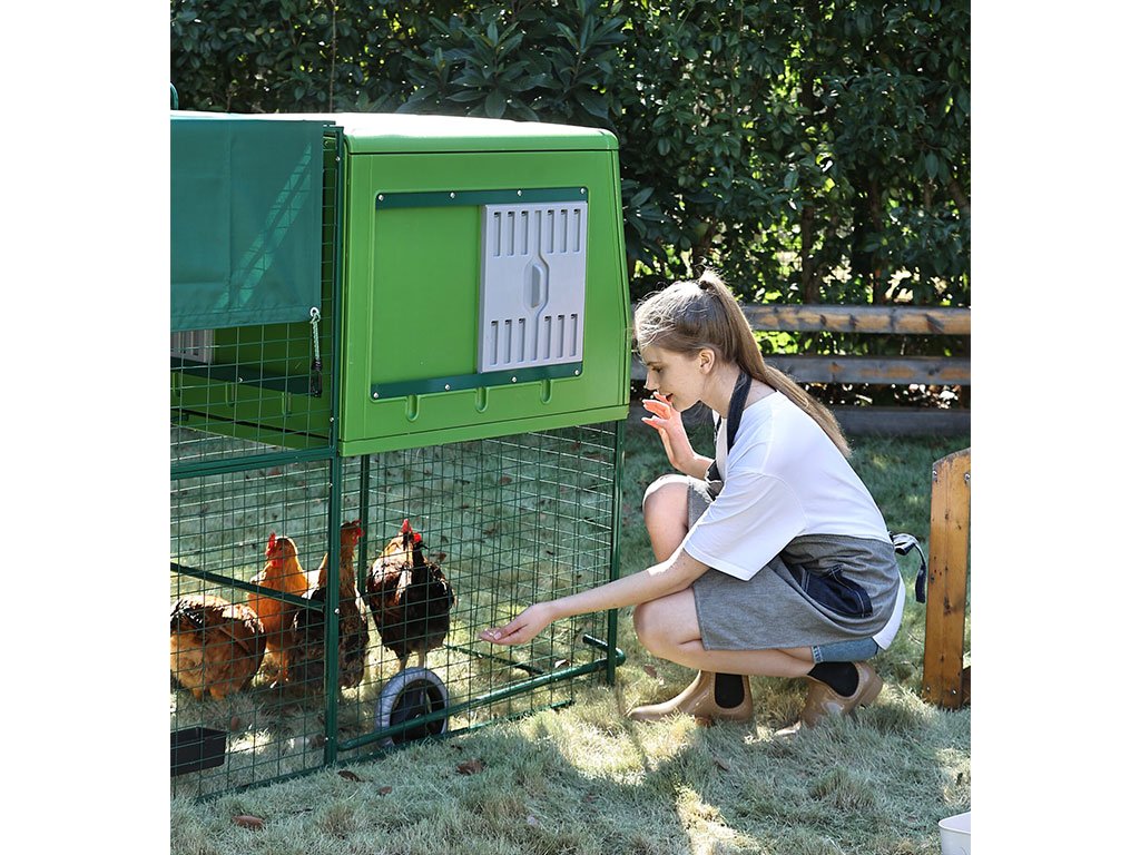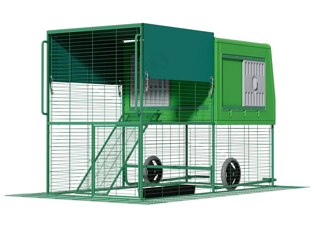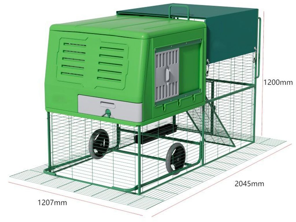 Mobilný kurín pre sliepky, vhodný pre 4-6 sliepok, integrovaný výbeh, kolieska pre ľahkú manipuláciu, kvalitný a odolný materiál, ľahká údržba, moderný dizajn, rozmer 120,7x204,5x120 cm.