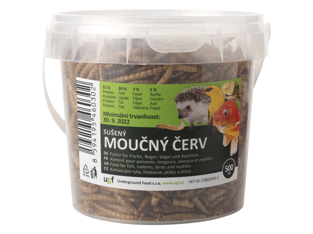 Larvy sušeného múčneho červa sú 100% prírodné doplnkové krmivo vtákov, rýb, jašteričiek, leguánov, korytnačiek, žiab, ježkov, škrečkov, myší, potkanov a iných malých cicavcov, mačiek a psov.
