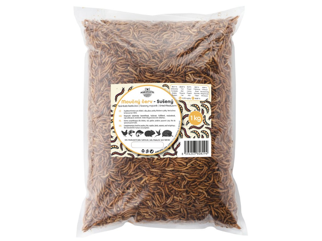 Larvy sušeného múčneho červa sú 100% prírodné doplnkové krmivo vtákov, rýb, jašteričiek, leguánov, korytnačiek, žiab, ježkov, škrečkov, myší, potkanov a iných malých cicavcov, mačiek a psov.