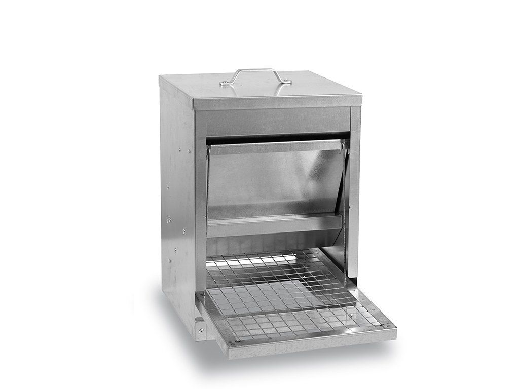 S vekom, nášľapnou plošinou a 5 Kg zásobníkom s rozmermi 280 x 415 x 385 mm - do 15 sliepok.