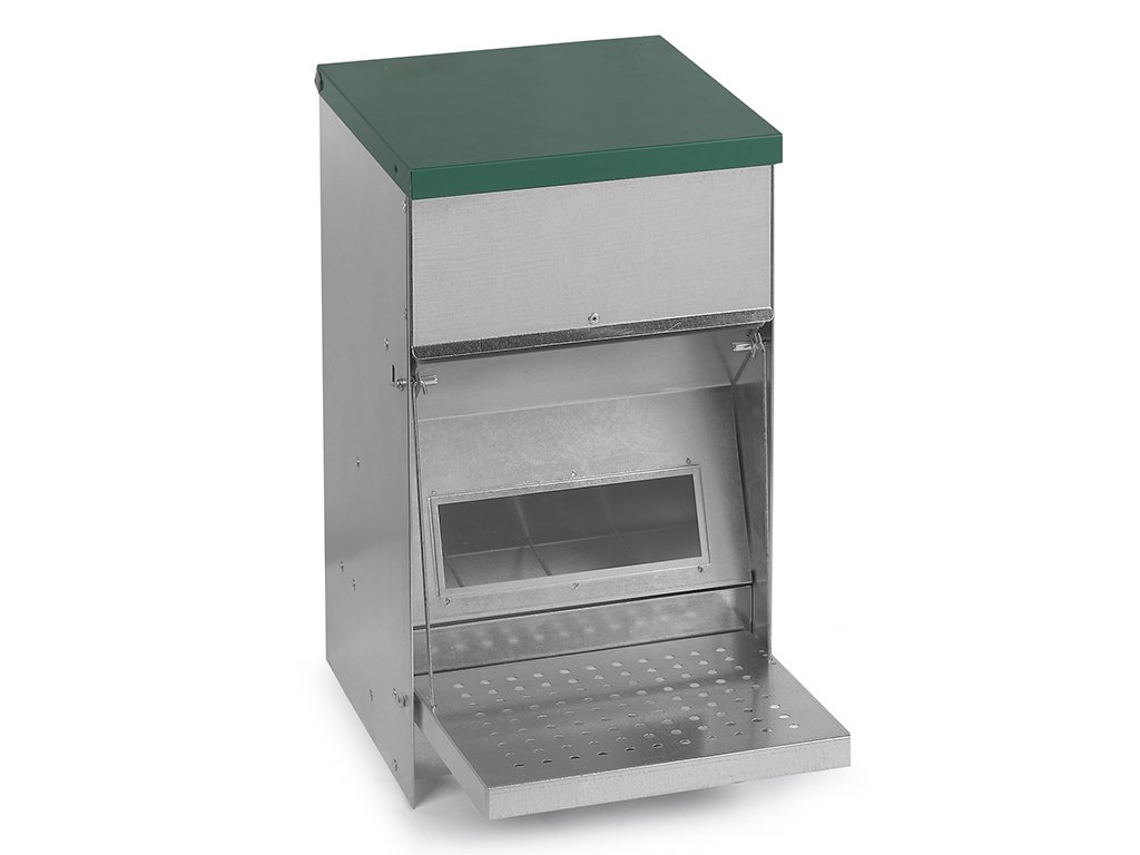 S vekom, nášľapnou plošinou a 10 kg zásobníkom s rozmermi 250 x 420 x 440 mm - do 25 sliepok.