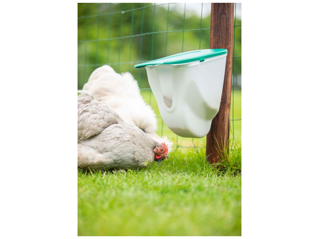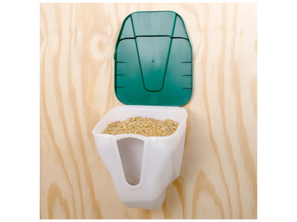 S krmítkom V-Feedr môžete dať zbohom rozsypanému krmivu idú pre vždy! Toto unikátne krmítko je vybavené špeciálnym V-tvarom násypky vo výške krku sliepky. Krk sliepky zakrýva krmítko počas zobania, čím minimalizuje rozsypané krmivo. Je ale dôležité, aby bolo krmítko V-Feedr zavesené v správnej výške.