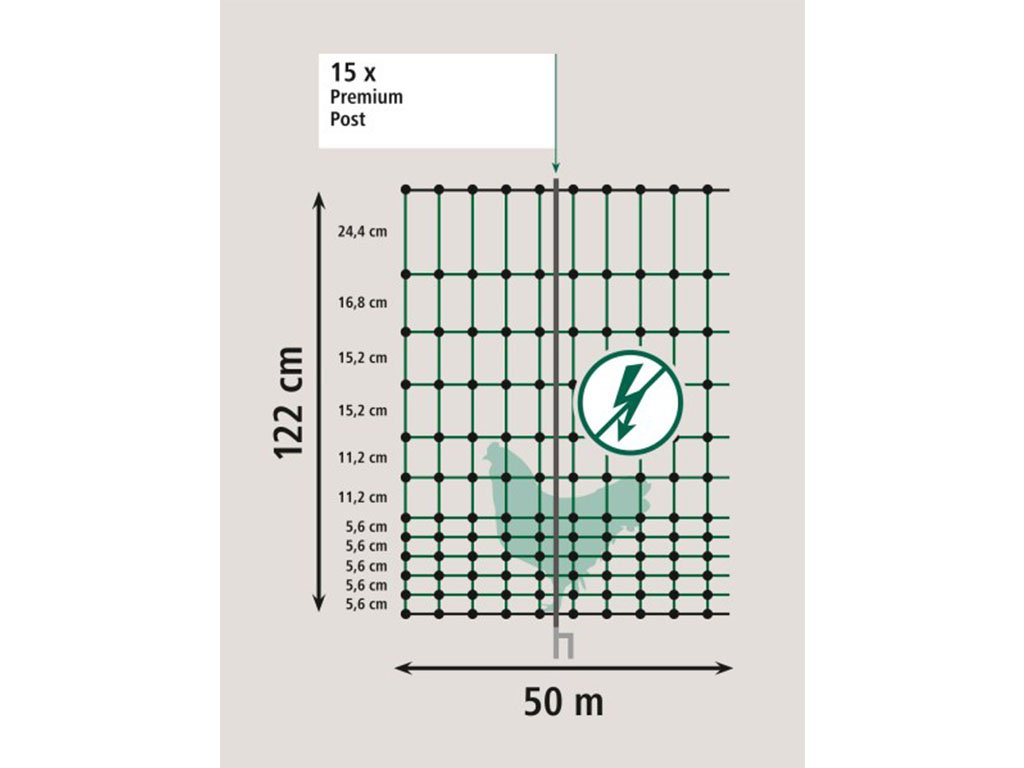 Ohradníková nevodivá sieť pre hydinu PREMIUM s výškou 122 cm a dĺžkou 50 m. Súčasťou balenia je 15 extrémne odolných stĺpikov s dvojitým pozinkovaným hrotom, ktoré zaisťujú vysokú stabilitu výbehu. Vďaka obzvlášť malej veľkosti ôk v spodnej časti, je sieť vhodná pre kurčatá alebo jahňatá.
