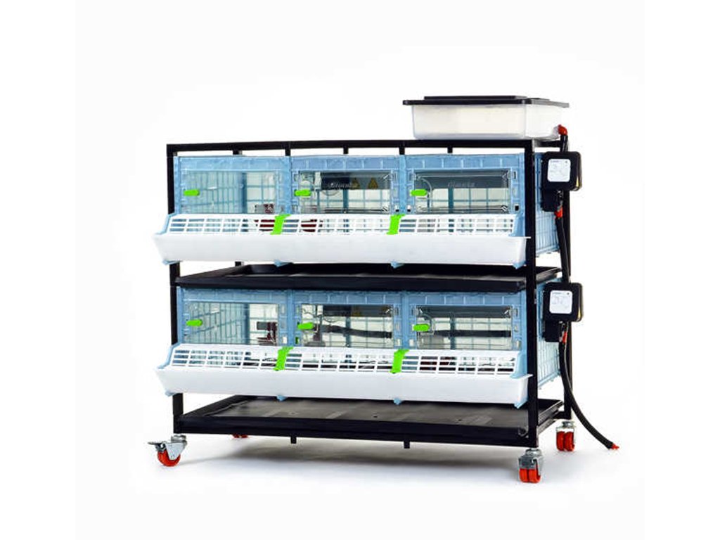Rozmery zloženej dvojposchodovej odchovne vrátane koliesok, nádržky na vodu, ohrevných jednotiek a kŕmidiel sú 104 x 60 x 91 cm.