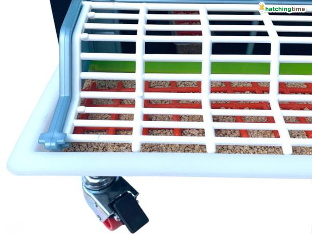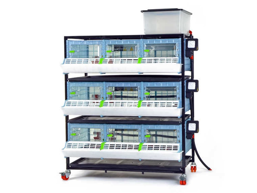 Rozmery zloženej trojposchodovej odchovne vrátane koliesok, nádržky na vodu, ohrevných jednotiek a kŕmidiel sú 104 x 60 x 132 cm.