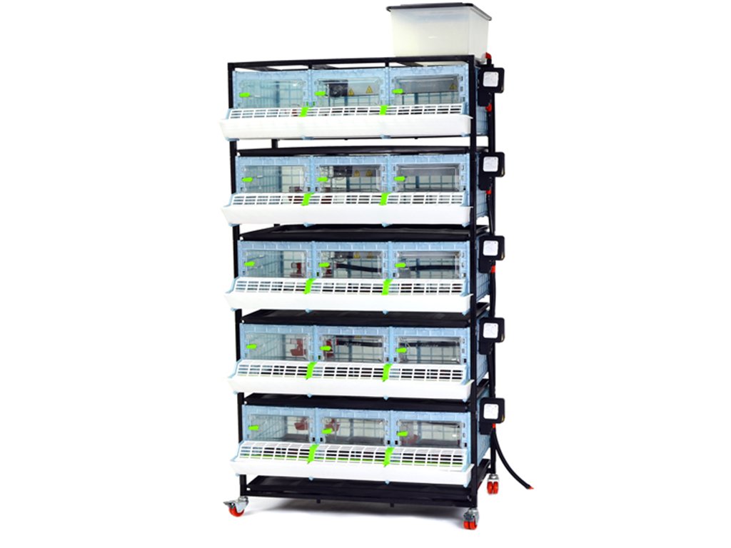 Rozmery zloženej päťposchodovej odchovne vrátane koliesok, nádržky na vodu, ohrevných jednotiek a kŕmidiel sú 104 x 60 x 196 cm.
