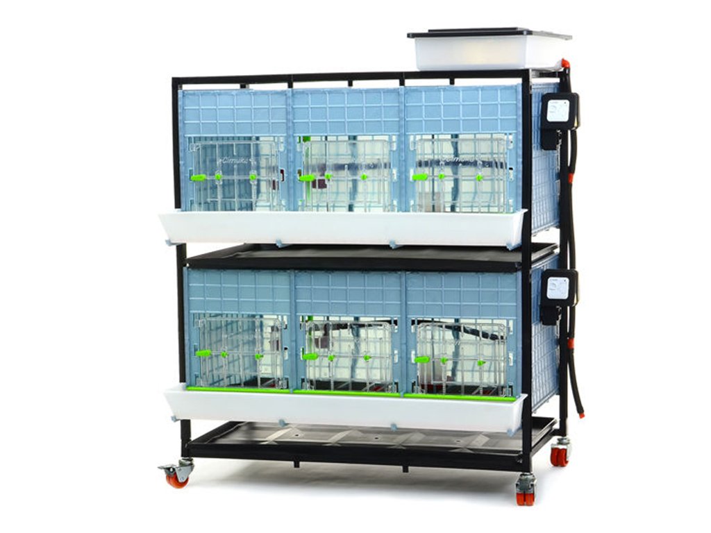 Rozmery zloženej dvojposchodovej odchovne vrátane koliesok, nádržky na vodu, ohrevných jednotiek a kŕmidiel sú 104 x 64 x 119 cm.