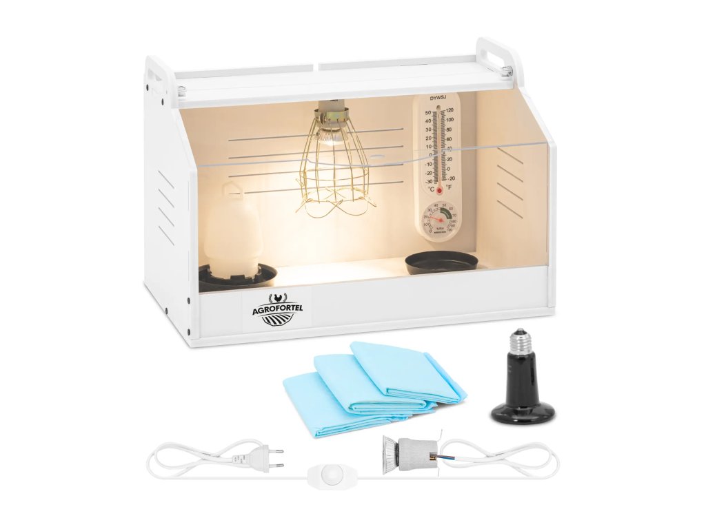 - Kompletná sada príslušenstva : V balení nájdete misku na kŕmenie a napájačku, vykurovaciu lampu so stmievačom, vnútorné osvetlenie a teplomer s vlhkomerom.
