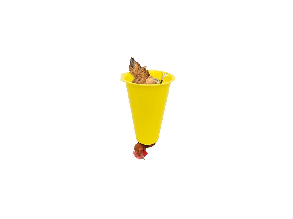 Plastový odkrvovač hydiny vhodný pri porážke stredne veľké hydiny akou sú sliepky a kačice. Určený k bezpečnému pridržanie hydiny, aby nedochádzalo k zraneniam pred usmrtením a pri následnom odkrveniu. Rozmery výrobku horný priemer: 29 cm, spodný priemer 9,5 cm, výška: 38 cm.