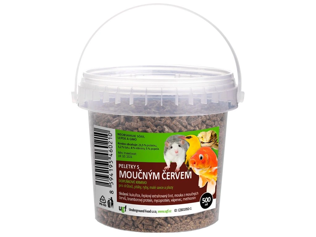 Peletky s múčnym červom sú špeciálne vyvinuté ako univerzálne krmivo pre vtáky, ryby, hlodavce a plazy s dôrazom na vyšší obsah proteínu (21,5 %) a nižší obsah tuku (3,2 %).