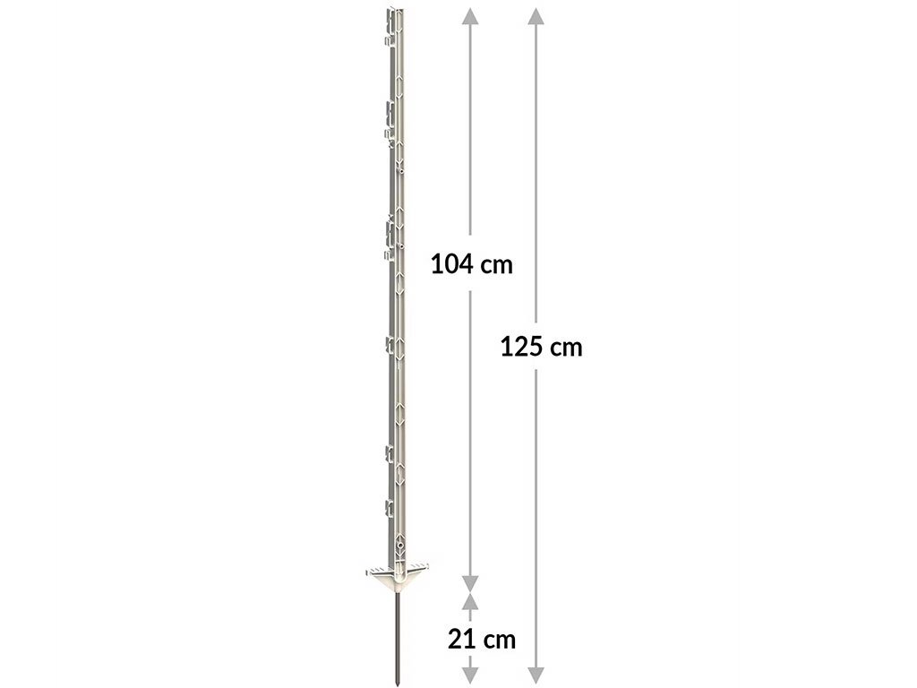 Plastový stĺpik, pre elektrický ohradník, vysoko kvalitný plast, vysoká odolnosť, využitie pre drôty, pásky, lanká, dvojitý nášľap, pozinkovaný hrot, dĺžka hrotu 21 cm, celková dĺžka 125 cm.