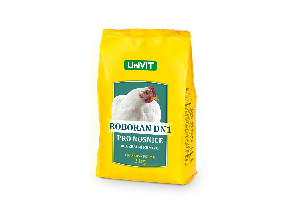 ROBORAN DN1 je vitamíno-minerálny prípravok do krmiva určený nosniciam od začiatku do konca znášky. Dopĺňa kŕmnu dávku o potrebné vitamíny, aminokyseliny (metionín a lyzín), makro- a mikrominerálne látky (Fe, Cu, Zn, Mn, J, Co, Se) v optimálnych dávkach. Vápnik potrebný na tvorbu vajec je zo 60-70% hradený priamo z krmiva az 30-40% je čerpaný z kostí. Fosfor v krmivách rastlinného pôvodu je viazaný v soliach kyseliny fytovej, ktorú hydina zle využíva, preto je do ROBORANU DN1 pridaný enzým fytáza.