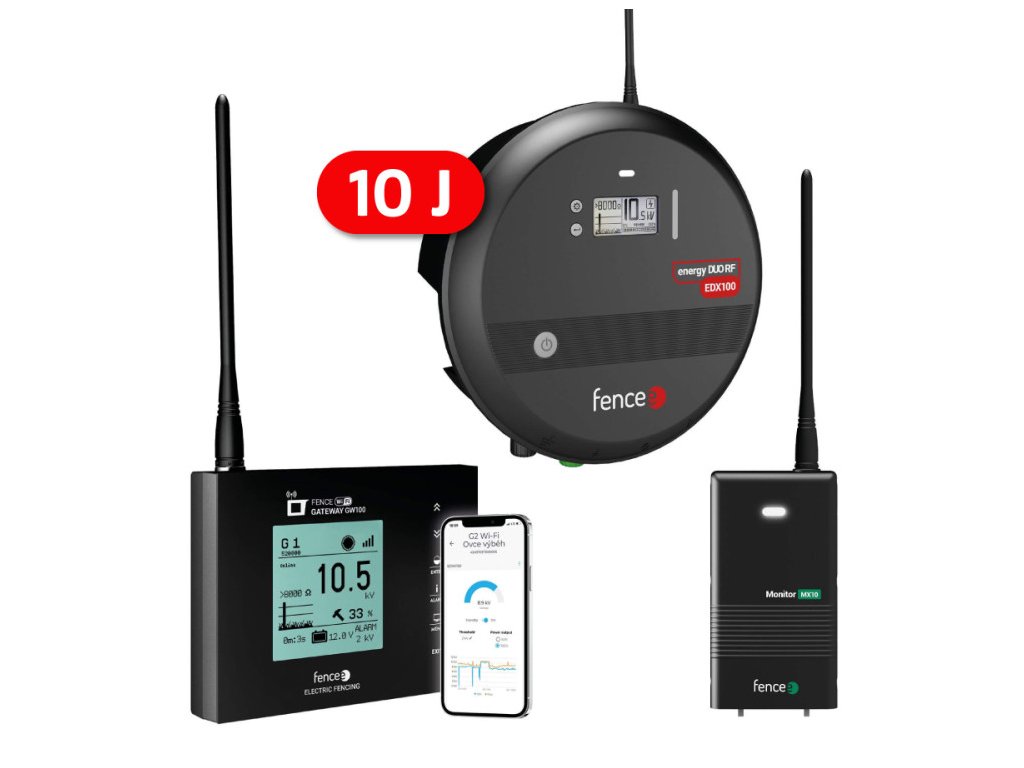 Súprava chytrého elektrického ohradníka s kombinovaným RF generátorom energy DUO RF EDX100 s výkonom až 10 J a centrálnou jednotkou FENCE WiFi GATEWAY GW100 . Sada je pripravená na okamžité pripojenie na fencee Cloud a vzdialené ovládanie mobilným telefónom alebo z PC. Výkonný šikovný zdroj elektrického ohradníka je vhodný aj pre veľmi dlhé ohrady až 90 km a je možné použiť pre všetky druhy zvierat. V sade je aj kontrolné zariadenie Monitor MX10 , ktorý dostanete úplne zadarmo.