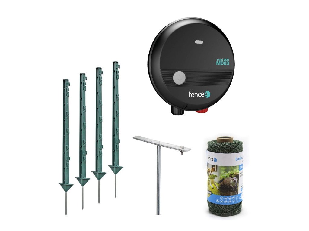 Úplná sada ohradníka s kompletným vybavením na inštaláciu malej ohrady. Domáci elektrický ohradníkový set vhodný pre psy, mačky, králiky a iné malé zvieratá. Ohradníková sada je možné použiť aj na ochranu pozemku, záhrady a domu pred škodcami a malými predátormi. Elektrickým ohradníkom ľahko a rýchlo vymedzíte priestor na voľný pohyb vašich zvierat a zároveň zabránite prístupu do zakázaných miest, napr. záhony. Možno použiť na ochranu chovných rybníkov a jazierok s Koi kapry, karasy, lieny a jesetery. Spoľahlivá ochrana proti vydrám a volavkám.Kompletný set ohradníka so spoľahlivým generátorom fencee mini DUO MD03 s výkonom 0,3 J, ktorý dokáže napájať ohradu s dĺžkou až 5 km. Malý prenosný ohradníkový zdroj s možnosťou prepnutia do úsporného režimu, ktorý výrazne predĺži výdrž pripojenej batérie.
