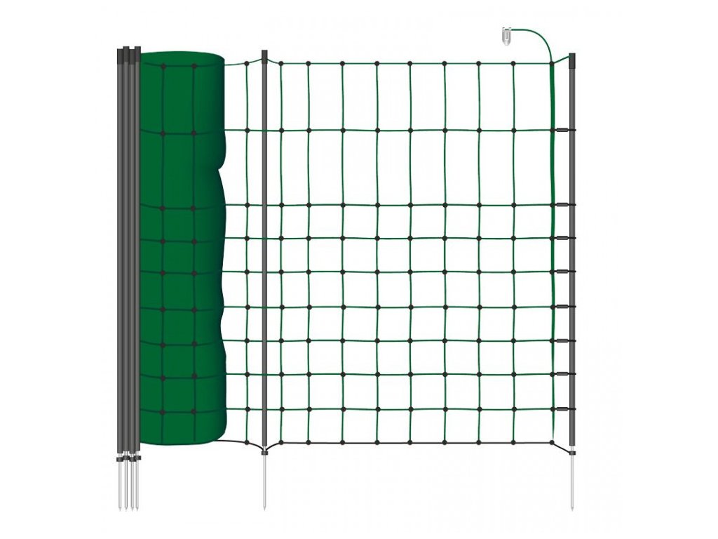 Elektrická sieť s 20 tyčami má 9 vodorovných vodiacich laniek s 3 x 0,20 mm silným nerezovým vodičom + 1 spodný rad (čierne lanko) je nevodivé, izoluje.Sieť je vhodná pre výbeh zvierat alebo na ochranu pozemku.