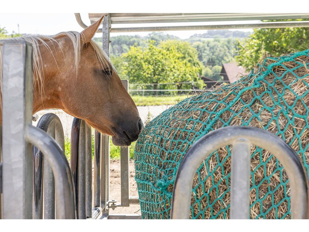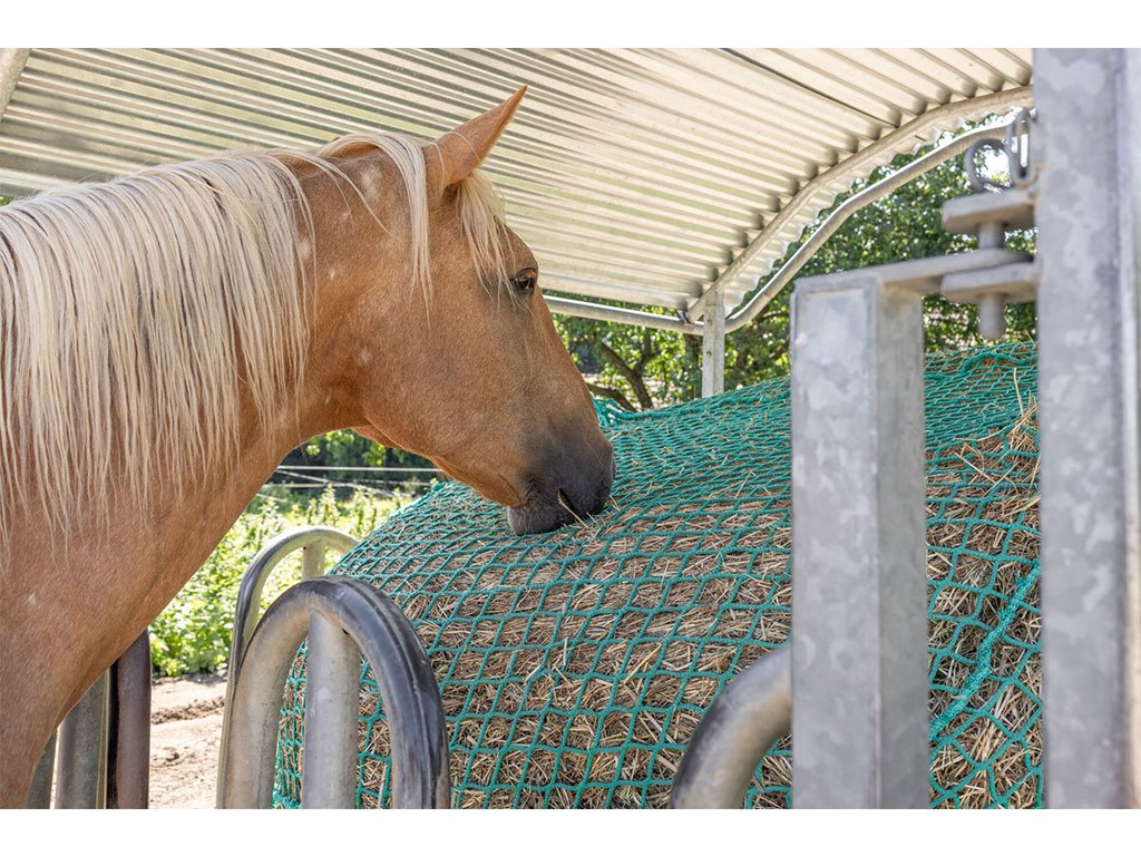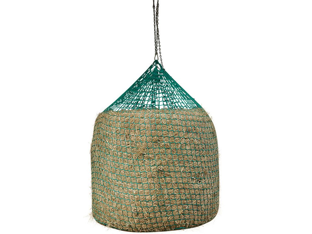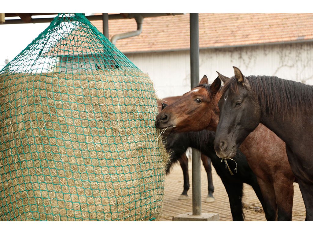Kŕmna sieť na seno, veľkosť oka 4,5 cm, odolné proti roztrhnutiu, mäkký a šetrný materiál, univerzálne použitie, lano hrúbka 6 mm, rozmery 150x180 cm.