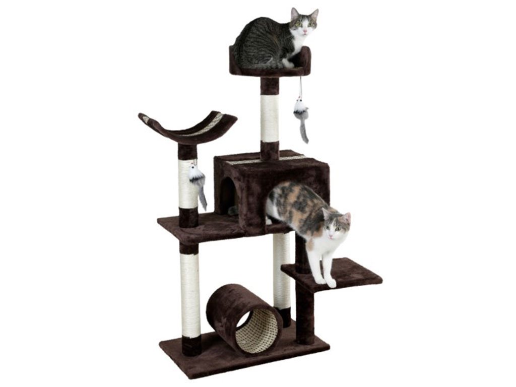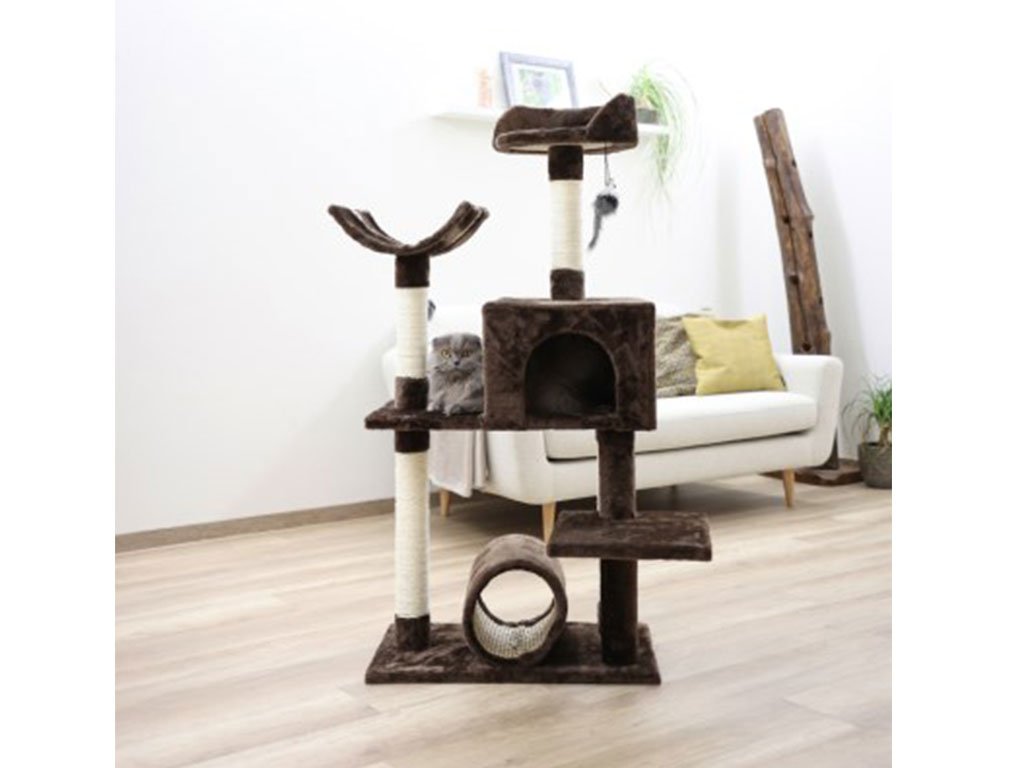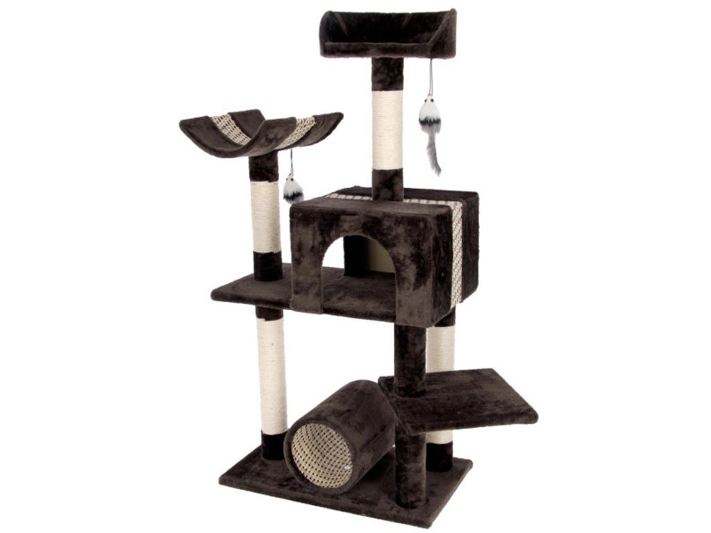 Luxusné škrabadlo a odpočívadlo 3v1 z prémiového radu Safari v elegantnom tmavo hnedom prevedení s tromi lehátkami, tunelom a domčekom. Mačacie strom poskytne Vašim miláčikom útulné útočisko ako pre odpočinok tak radostné šantenie.