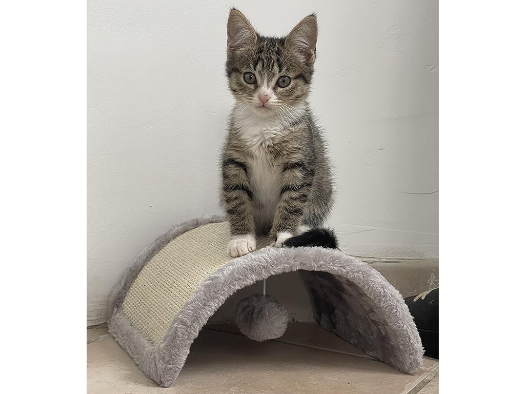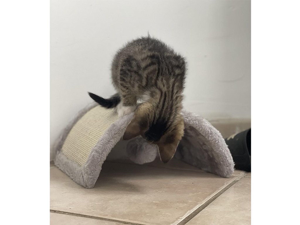 Škrabadlo pre mačky, v tvare mosta s loptičkou, sisalové škrabadlo, plyšové okraje a loptička, rozmery 26x22x11cm.