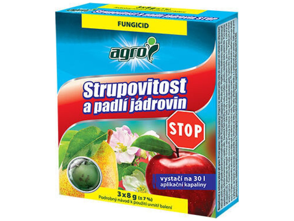 AGRO Strupovitosť a múčnatka jadrovín STOP je systémový fungicíd vo forme granúl určený na ochranu rastlín. Tento prípravok je ideálny pre ochranu proti chrastavitosti jadrovín a múčnatke jabloňovému, a to ako preventívne, tak aj kuratívne po infekcii. Ďalej je vhodný na ochranu proti skládkovým chorobám. Chráni rastlinu pred napadnutím (prevencia) aj po infekcii (kuratívny účinok). Biologický účinok sa neznižuje ani po výdatných dažďoch. Efektívna ochrana proti skládkovým chorobám pri aplikácii od 6 týždňov pred zberom.